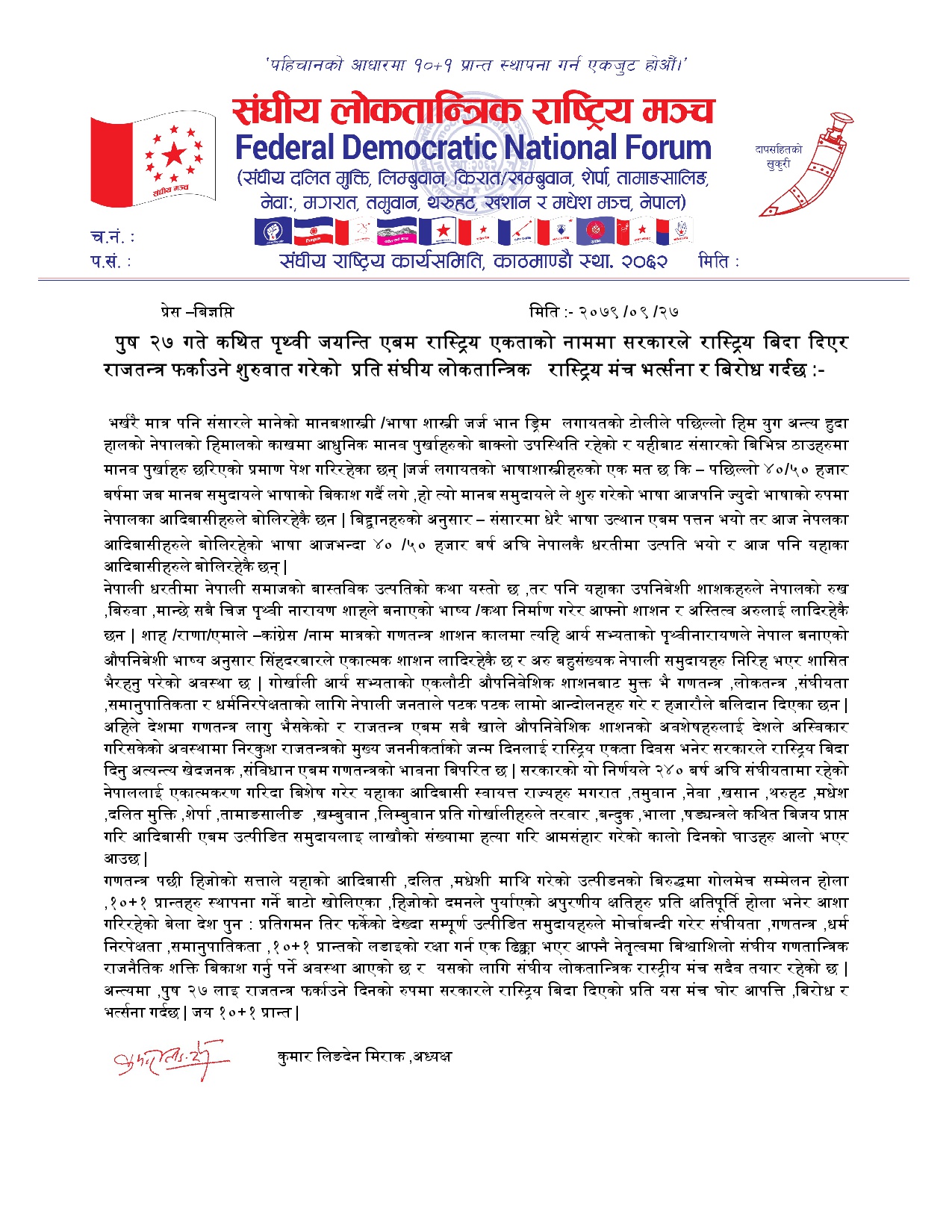 दमक, २७ पुष । संघीय लोकतान्त्रिक राष्ट्रिय मञ्चले पुष २७ गतेलाई पृथ्वी जयन्ती एवम् राष्ट्रिय एकताको नाममा सरकारले दिएको राष्ट्रिय विदाको भर्त्सना तथा विरोध गरेको छ । सरकारले राजतन्त्र फर्काउने शुरुवात गरेको भन्दै मञ्चका अध्यक्ष कुमार लिङदेनले एक विज्ञप्ति प्रकाशित गर्दै विरोध जनाएको हो ।