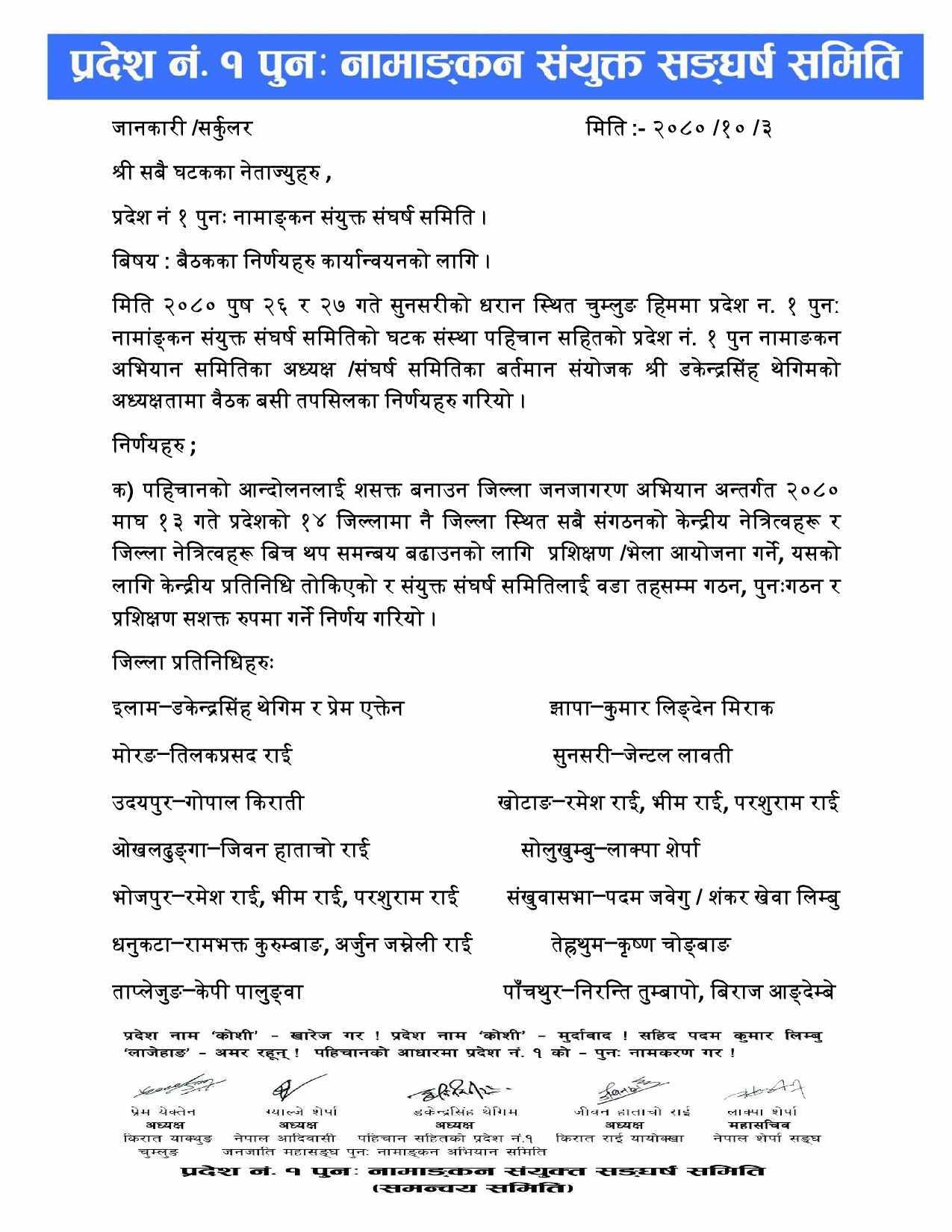 समितिले जारी गरेको विज्ञप्तिमा उल्लेख भएअनुसार ताप्लेजुङ जिल्ला केपी पालुङ्वा, पाँचथर निरन्ती तुम्बापो र विराज आङ्देम्बे, इलाम डकेन्द्रसिंह थेगीम र प्रेम येक्तेन, झापा कुमार लिङ्देन, मोरङ् तिलकप्रसाद राई, सुनसरी जेन्टल लावती, उदयपुर गोपाल किराती, धनकुटा रामभक्त कुरुम्बाङ र अर्जुन जम्नेली राई, संखुवासभा पदम जवेगु र शंकर खेवा, खोटाङ रमेश राई, भिम राई र पर्शुराम राई, ओखलढुंगा जिवन हाताछो राई र सोलुखुम्बु लाक्पा शेर्पालाई जिम्मेवारी तोकिएको छ ।