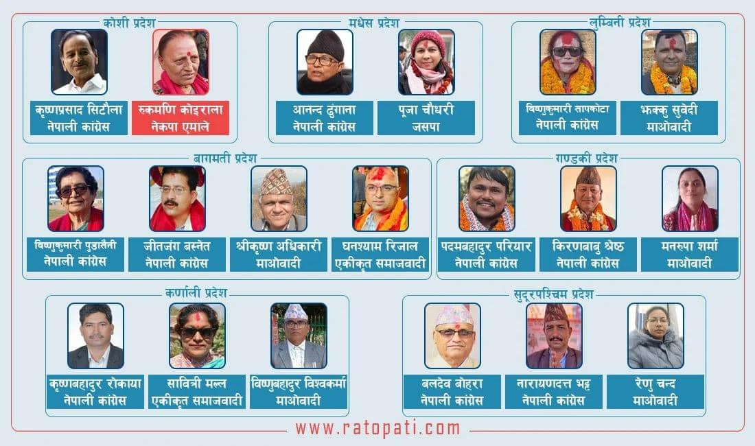 बागमती प्रदेशबाट नेपाली कांग्रेसबाट विष्णुकुमारी पुडासैनी, जीतजंग बस्नेत त्यसैगरी माओवादीबाट श्रीकृष्ण अधिकारी र एकीकृत समाजवादीबाट घनश्याम रिजाल निर्वाचित भएका छन् । यसरी नै लुम्बिनी प्रदेशबाट बिष्णुकुमारी सापकोटा नेपाली कांग्रेसबाट निर्वाचित हुँदा माओवादीबाट झक्कु सुवेदी निर्वाचित भएका छन् ।