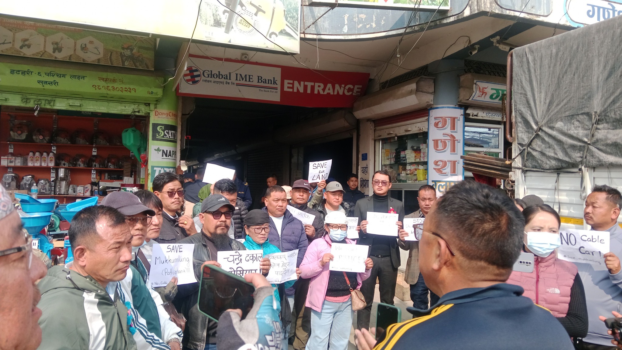 त्यसक्रममा केबलकार सञ्चालक आईएमई ग्रुपका अध्यक्ष चन्द्र ढकालविरुद्ध नाराबाजीसमेत गरेका छन् । उनीहरूले बलजफ्ती गरेर अघि बढेमा अझै कडा रुपमा प्रतिरोध थाल्ने चेतावनीसमेत दिएका छन् । मुक्कुमलुङ पाथीभारामा निर्माण कम्पनी हिमालय कन्स्ट्रक्सनले ठेक्का लिएर केबलकार निर्माण अघि बढाएको छ ।