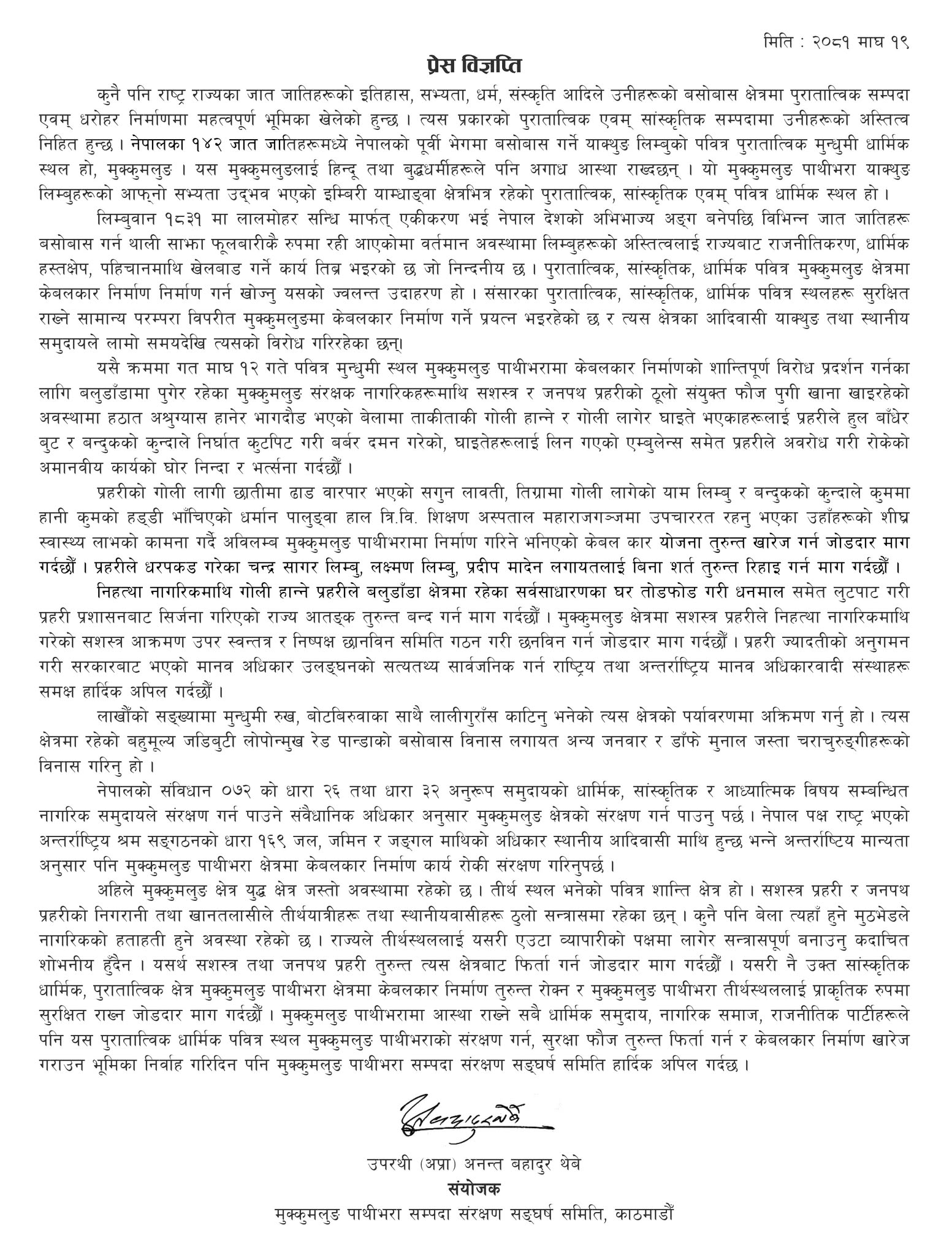 आज (शनिबार) सङ्घर्ष समितिले रिपोर्टर्स क्लब नेपालमा पत्रकार सम्मेलन गरेर मुक्कुमलुङको महिमाबारे प्रकाश पार्दै सम्पदा मास्ने कार्य स्विकार्य नभएको चेतावनी दिएको हो । संघर्ष समिति काठमाडौंका संयोजक नेपाली सेनाका अवकाश प्राप्त उपरथी अनन्तबहादुर थेबेले पाथीभरा (मुक्कुम्लुङ) किराँत, हिन्दु र बौद्धमार्गीहरुको साझा धार्मिकस्थल रहेको बताएका छन् ।