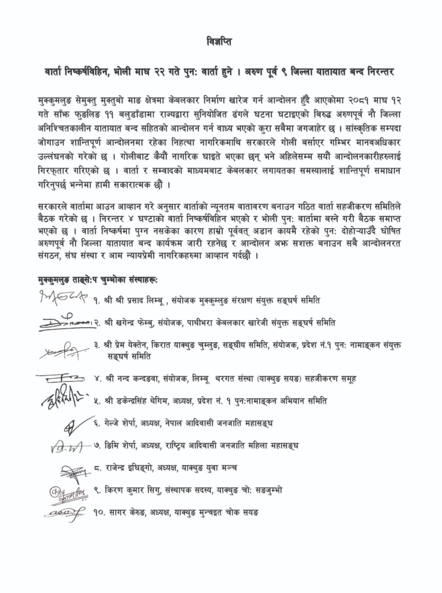 यता आन्दोलनरत पक्ष मुक्कुमलुङ ताङसेःप चुम्भो र मुक्कलुङ संरक्षण अन्तरदीय संघर्ष समितिले सोमबार राती विज्ञप्ति जारी गर्दै २२ गते देखिको अनिश्चित आम हड्ताललाई नौं जिल्ला यातायात मात्र बन्द भएको जनाएको छ । साथै, विज्ञप्ति मार्फत मुक्कुमलुङ पाथीभरा रक्षार्थ अथवा समर्थन गर्नुहुने सबै नागरिकहरु स्व्तस्फूर्त यातायात बन्द कार्यक्रममा सहभागि भई दिन समेत अपिल गरेको छ ।