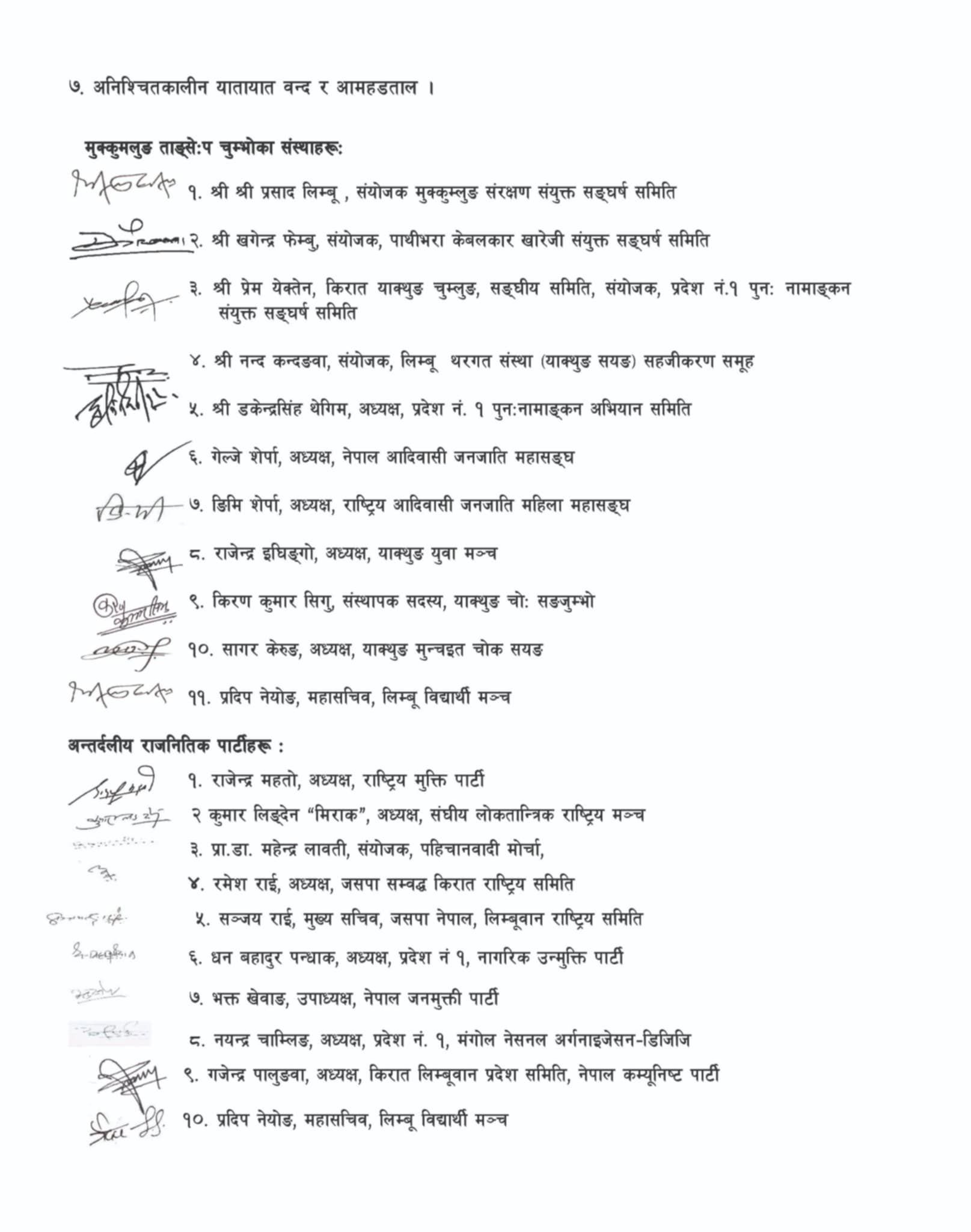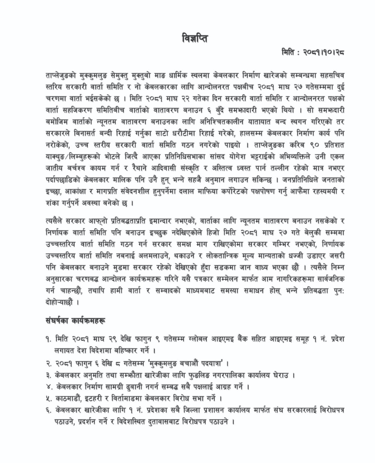उनीहरूले माघ २७ गते बेलुकासम्म उच्चस्तरीय वार्ता टोली गठन गर्न माग गरेका थि ए। सरकारले माग सम्बोधन नगरेकाले फेरि आन्दोलनका कार्यक्रम घोषणा गर्नुपरेको मुक्कुमलुङ ताङ्सेप र अन्तरदलीय संघर्ष समितिका नेताहरुले बताएका छन् ।