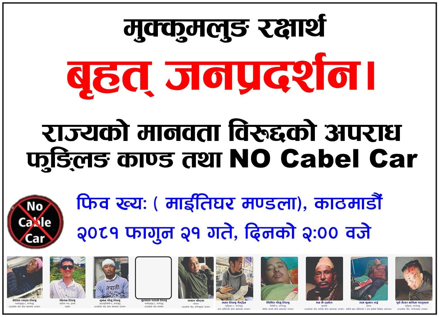 ललितपुर, २२ फाल्गुन ।  मुक्कुमलुङमा केवलकार निर्माण खारेजी पक्षधरले मुक्कुमलुङ रक्षार्थ र राज्यको मानवता बिरोधि ‘फुङलीङ काण्ड’ विरुद्ध काठमाडौंमा बृहत् प्रदर्शन गरेका छन् ।