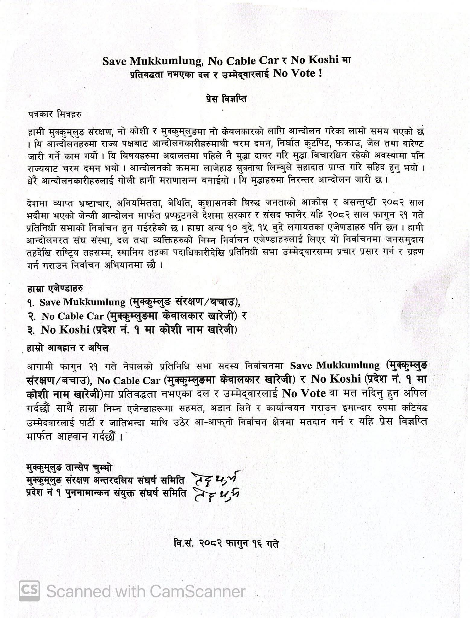 एक विज्ञप्ति जारी गर्दै मुख्य तीन एजेण्डाहरु मुक्कुमलुङ संरक्षण तथा बचाउ, मुक्कुम्लुङ क्षेत्रमा प्रस्तावित केवलकार परियोजना खारेजी र प्रदेश नं. १ को नाम ‘कोशी’ खारेजको एजेण्डा अघि सार्दै ती एजेण्डामा प्रतिबद्धता नजनाउने दल तथा उम्मेदवारलाई ताप्लेजुङ जिल्लाबासी मतदाताहरुलाई आव्हान गरेको हो ।