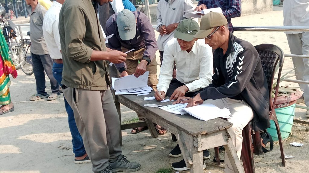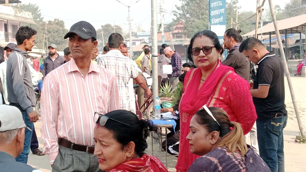 मतदाताहरू भोट हाल्नका लागि मतदान केन्द्रहरूमा लाइनमा उभिएका छन् ।