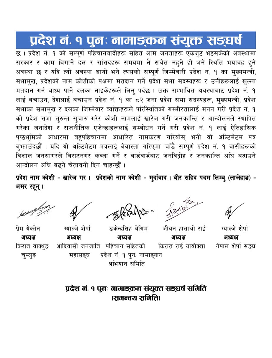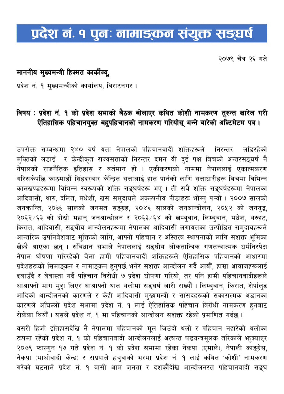 ‘उक्त सम्भावित अवस्थाबाट प्रदेश नं. १ लाई बचाउन, देशलाई बचाउन प्रदेश नं। १ का ८२ जना प्रदेश सभा सदस्यहरू, मुख्यमन्त्री, प्रदेश सभाका अध्यक्ष र दलका जिम्मेवार व्यक्तिहरूले परिस्थितिको गम्भीरतालाई मनन गरी आजको मितिले १० दिन भित्रमा प्रदेश नं. १ को प्रदेश सभा सुचारु गरेर कोशी नामलाई खारेजी गरी आन्दोलनरत पक्षसँग सहमति गरी प्रदेश नं. १ लाई ऐतिहासिक पहिचानमा आधारित नामकरण गरियोस भनी यो १० दिने कडा अल्टिमेटम पत्र बुझाउदछौ । यदि यो अल्टिमेटम पत्रलाई बेवास्ता गरिएमा पचासौँ हजार पहिचानवादीहरूले महिनौ दिन विराटनगर कब्जा गर्ने र वार्डवार्डबाट जनविद्रोह र जनक्रान्ति अघि बढाउने आन्दोलन अघि बढ्ने चेतावनी समेत दिएका छन् ।