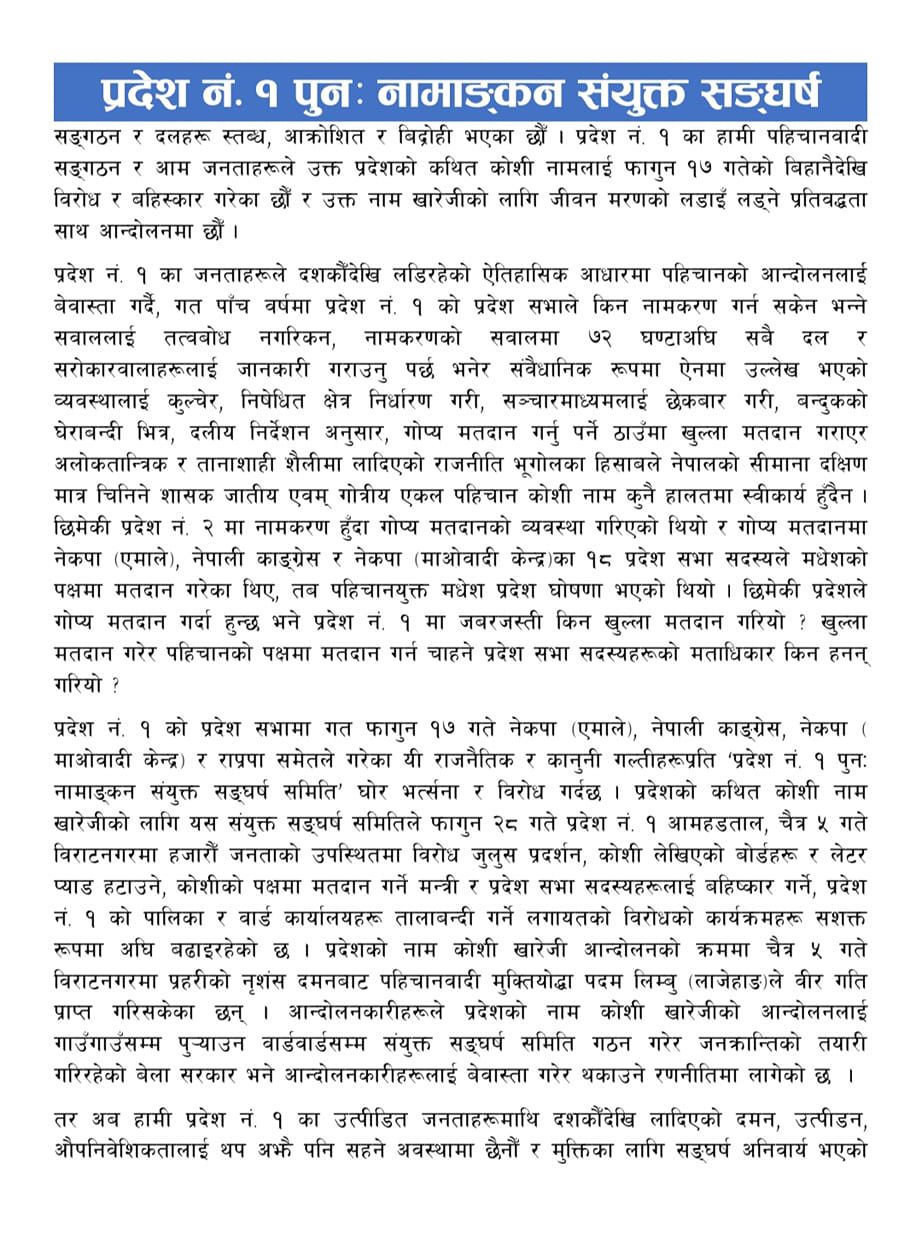 यसरी ज्ञापन पत्रमा लेखिएको छ ‘यसरी हिजो इतिहासदेखि नै नेपालमा पहिचानको मूल जिउँदो थलो र पहिचान नहारेको थलोका रूपमा रहेको प्रदेश नं. १ को पहिचानवादी आन्दोलनलाई अत्यन्त षडयन्त्रमूलक तरिकाले झुक्याएर २०७९ फाल्गुन १७ गते प्रदेश नं. १ को प्रदेश सभामा रहेका नेकपा (एमाले), नेपाली काङ्ग्रेस र नेकपा माओवादी केन्द्र पार्टीहरूले हचुवाको भरमा प्रदेश नं. १ लाई कथित ‘कोशी’ नामाकरण गरेको घटनाले प्रदेश नं. १ मा दशकौँदेखि आन्दोलनरत हामी पहिचानवादी सङ्घ सङ्गठनहरू स्तब्ध, आक्रोशित र बिद्रोही भएका छौ । प्रदेश नं. १ का हामी पहिचानवादी सङ्गठनहरूले उक्त कथित कोशी नामलाई फाल्गुन १७ गतेको बिहानैदेखि विरोध, बहिस्कार, खारेजी गरेका छौँ र उक्त कथित कोशी नाम खारेजीको लागि जीवन मरणको लडाइँ लड्ने प्रतिवद्धता गरिसकेका छौ ।’