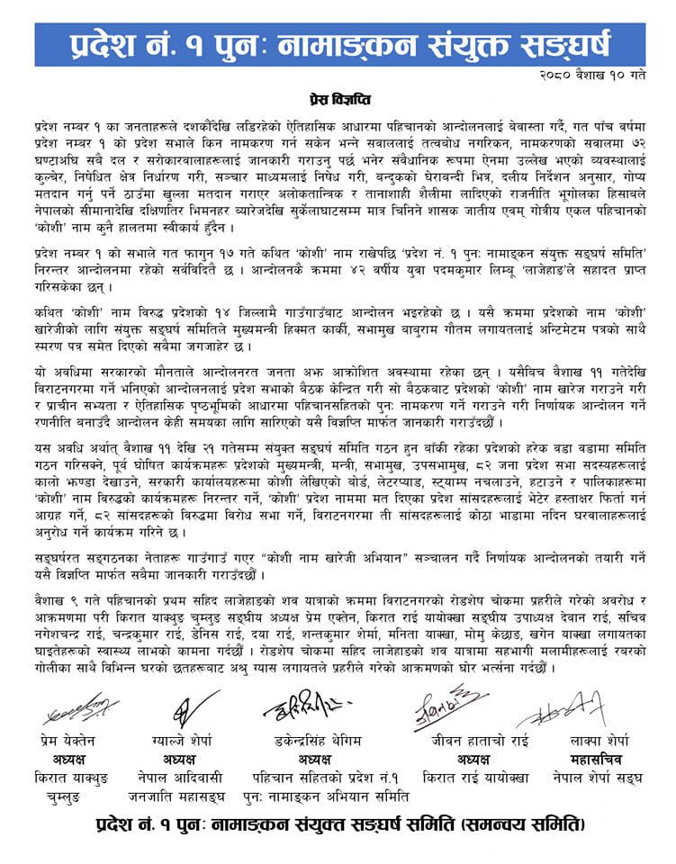 सङ्घर्षरत सङ्गठनका नेताहरू गाउँगाउँ गएर “कोशी नाम खारेजी अभियान” सञ्चालन गर्दै निर्णायक आन्दोलनको तयारी मा जुट्न समेत विज्ञप्ति मार्फत भनिएकाे छ ।