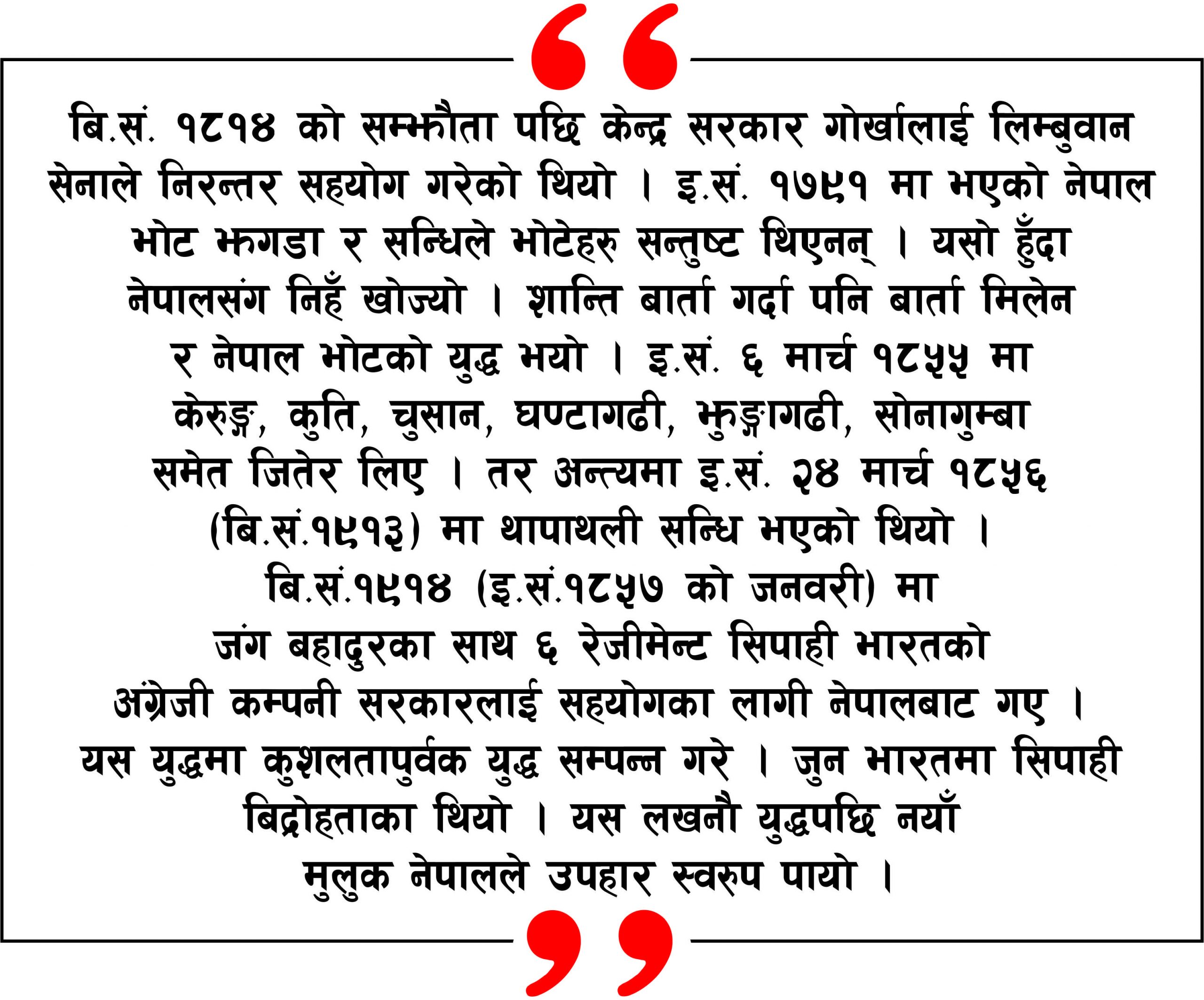 (८) बि.सं. १८१४ को सम्झौता पछि केन्द्र सरकार गोर्खालाई लिम्बुवान सेनाले निरन्तर सहयोग गरेको थियो । इ.सं. १७९१ मा भएको नेपाल भोट झगडा र सन्धिले भोटेहरु सन्तुष्ट थिएनन् । यसो हुँदा नेपालसंग निहँ खोज्यो । शान्ति बार्ता गर्दा पनि बार्ता मिलेन र नेपाल भोटको युद्ध भयो । इ.सं. ६ मार्च १८५५ मा केरुङ्ग, कुति, चुसान, घण्टागढी, झुङ्गागढी, सोनागुम्बा समेत जितेर लिए । तर अन्त्यमा इ.सं. २४ मार्च १८५६ (बि.सं.१९१३) मा थापाथली सन्धि भएको थियो । बि.सं.१९१४ (इ.सं.१८५७ को जनवरी) मा जंग बहादुरका साथ ६ रेजीमेन्ट सिपाही भारतको अंग्रेजी कम्पनी सरकारलाई सहयोगका लागी नेपालबाट गए । यस युद्धमा कुशलतापुर्वक युद्ध सम्पन्न गरे । जुन भारतमा सिपाही बिद्रोहताका थियो । यस लखनौ युद्धपछि नयाँ मुलुक नेपालले उपहार स्वरुप पायो । यी युद्धहरुमा किरातीहरुले कुशलता पुर्बक युद्ध हाँकेकाले राई लिम्बुबाट खुशी भई जंग बहादुरले क्षत्री सरह २ डोराको जनै लगाउनु भन्ने फेरी आदेश दिई कृत्रिम हिन्दु बनाउन असफल प्रयास गरेका थिए । अब जनै लगाउने कुरामा राई लिम्बु अफिसरहरुले मात्र निर्णय गर्न नसकि सुब्बा राई जिमीहरुलाई सोधनी गर्दा पुर्ब मंगोल किरात बँश शाखा जनै लगाउनु हुँदैन भनी खवर पठाए । यस्तै भैरवनाथ पल्टनका लेप्टेन हस्तबीर कुरुम्भङ्गले पनि जनै धारण गरी कृत्रिम आर्यन बन्नु हाम्रो धर्म संस्कारमा छैन र ंजनै धारणलाई स्वीकार नगर्नु भन्ने जवाफ लेखि पठाएका थिए । यसै समयमा धनकुटामा ३ मन जनै पठाइएकोमा सबै नदीमा हाली बगाए भने ताप्लेजोङमा पनि त्यसै गरे । पल्लो किरात लिम्बूवान नागरीकहरुको इमान्दारीता र युद्ध कौशलका कारण जनै बहिस्कार गर्दा जंग बहादुर राई लिम्बूबाट सा¥है चिडिएका भए पनि अब तिमीहरु नमासीने जात हो भनी बि.सं. १९१७ सालमा सनद पत्र दिन बाध्य भएका थिए ।