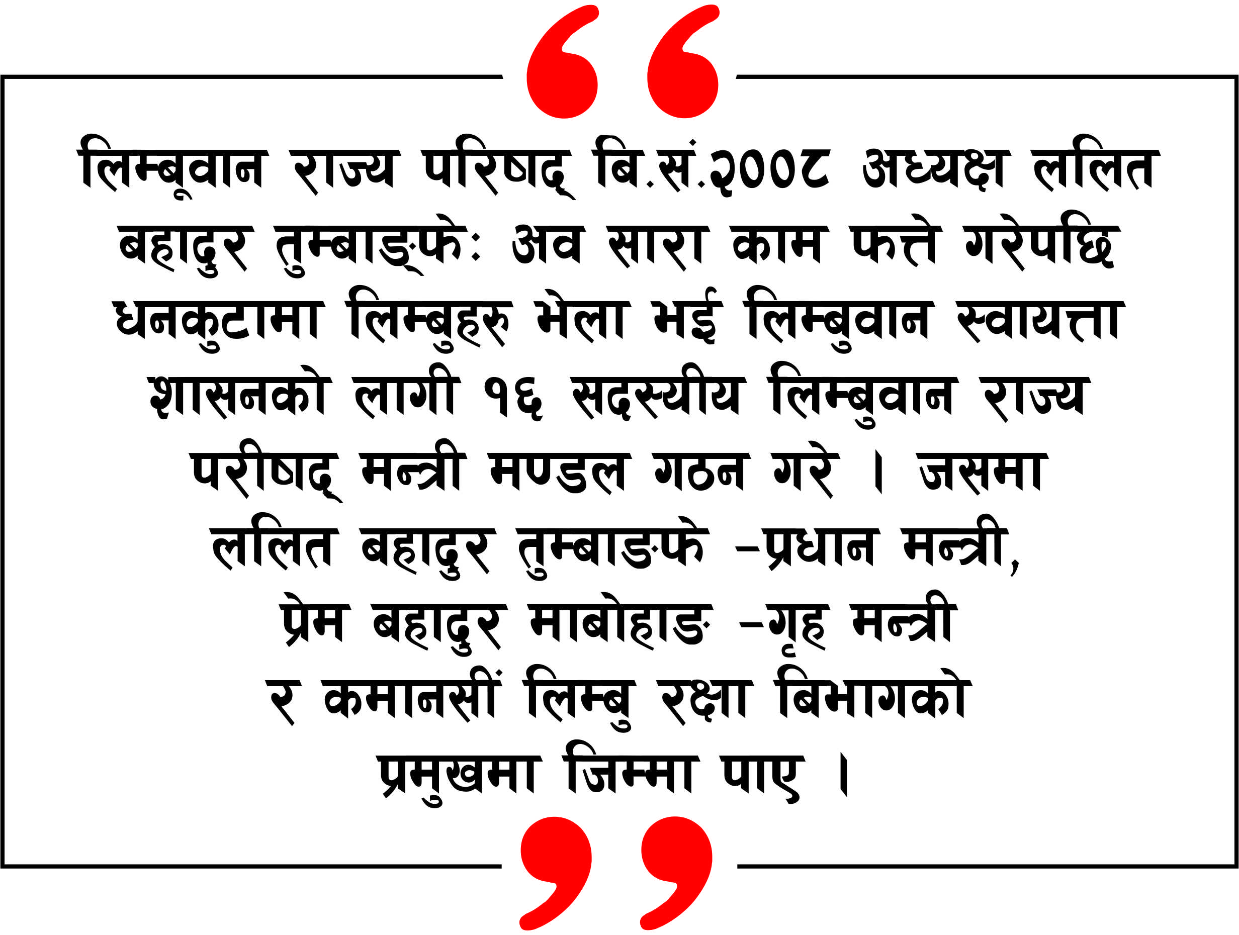 (१८) लिम्बूवान राज्य परिषद् बि.सं.२००८ अध्यक्ष ललित बहादुर तुम्बाङ्फेः अव सारा काम फत्ते गरेपछि धनकुटामा लिम्बुहरु भेला भई लिम्बुवान स्वायत्ता शासनको लागी १६ सदस्यीय लिम्बुवान राज्य परीषद् मन्त्री मण्डल गठन गरे । जसमा ललित बहादुर तुम्बाङफे –प्रधान मन्त्री, प्रेम बहादुर माबोहाङ –गृह मन्त्री र कमानसीं लिम्बु रक्षा बिभागको प्रमुखमा जिम्मा पाए ।