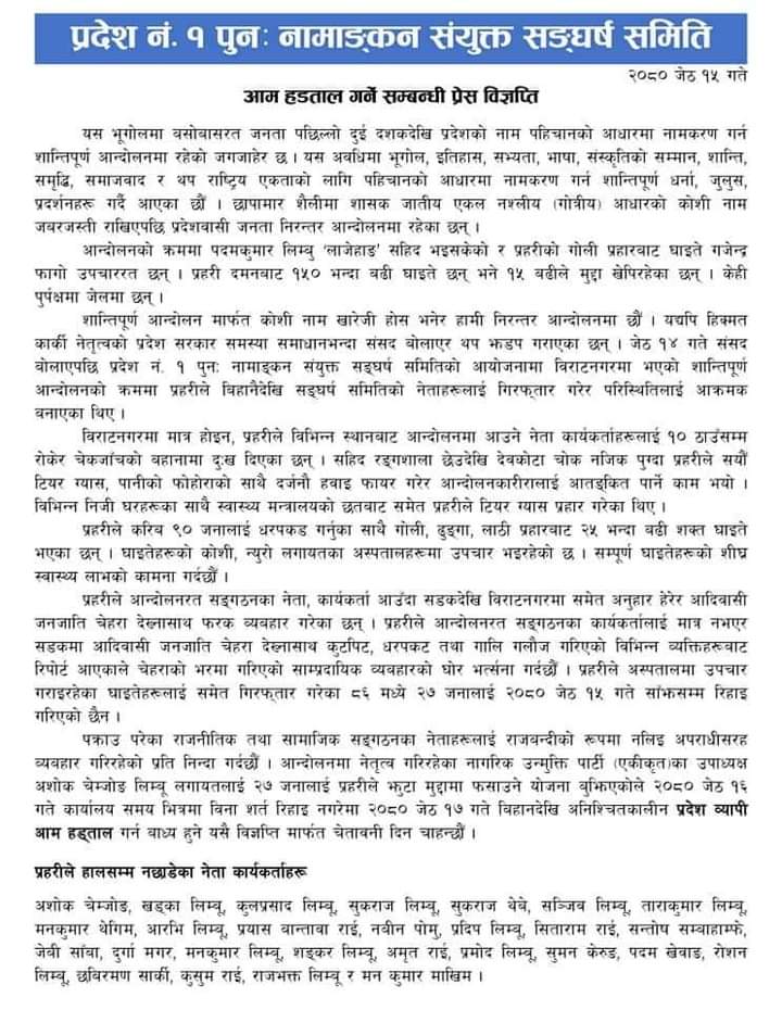 दमक, १६ जेष्ठ । प्रदेश नं. १ पुन: नामाङ्कन संयुक्त सङ्घर्ष समिति (समन्वय समिति) ले आम हडताल गर्ने चेतावनी दिएको छ ।