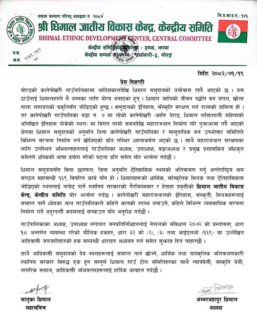 यसै सन्दर्भमा धिमाल जातिय विकास संस्थाले पनि शुक्रबार एक विज्ञप्ति जारी गर्दै साे कार्यकाे भत्सर्ना गरेकाे छ ।