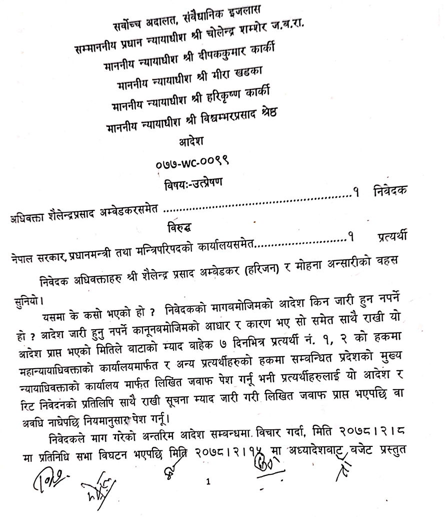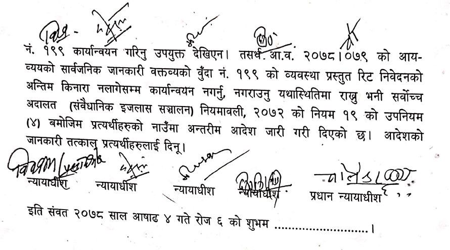 शुक्रबार प्रधानन्यायाधीश चोलेन्द्र शम्शेर जबरा, न्यायाधीशहरु दीपककुमार कार्की, मीरा खड्का, हरिकृष्ण कार्की र विश्वम्भरप्रसाद श्रेष्ठको इजलासले बजेट बक्तव्यको बुँदा नम्बर १९९ तत्काल कार्यान्वयन नगर्न अन्तरिम आदेश दिएको हो ।