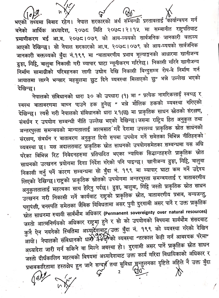 हाल नेपालबाट ढुंगा, गिटी र बालुवा निकासी गर्न प्रतिबन्ध छ । तर सरकारले बजेट वक्तव्य मार्फतनै यि नदीजन्य पदार्थ खुला गर्न लागेको भन्दै सर्वोच्च अदालतमा सातवटा रिट परेको थियो । उक्त रिटमाथि सुनुवाइ गर्दै शुक्रबार संवैधानिक इजलासले सरकारसँग ढुंगा, गिटी, बालुवा निकासी खुला गर्नुको कारण पनि माग गरेको छ ।