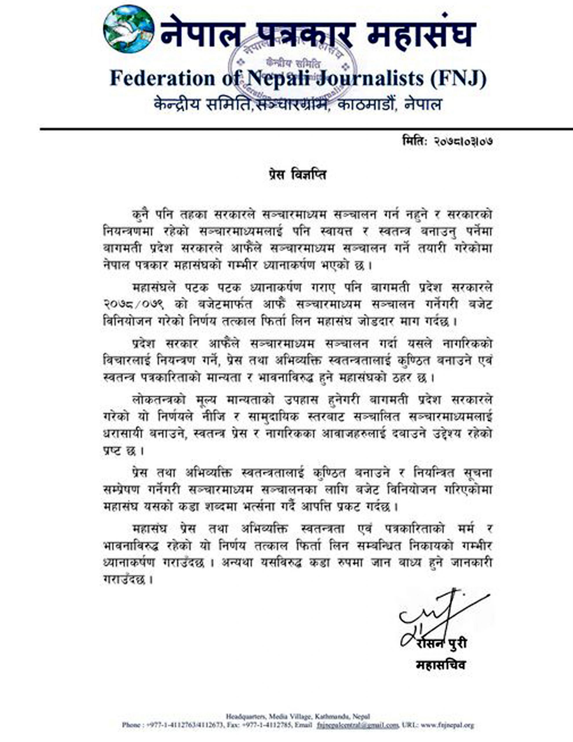 लोकतन्त्रको मूल्य मान्यताको उपहास हुनेगरी बागमती प्रदेश सरकारले गरेको यो निणर्यले नीजि र सामुदायिक स्तरबाट सञ्चालित सञ्चारमाध्यमलाई धरासायी बनाउने, स्वतन्त्र प्रेस र नागरिकका आवाजहरुलाई दबाउने उद्देश्य रहेको प्रष्ट छ । सञ्चारमाध्यम सञ्चालनका लागि बजेट विनियोजन गरिएकोमा महासंघ यसको कडा शब्दमा भर्त्सना गर्दै आपत्ति प्रकट गर्दछ ।