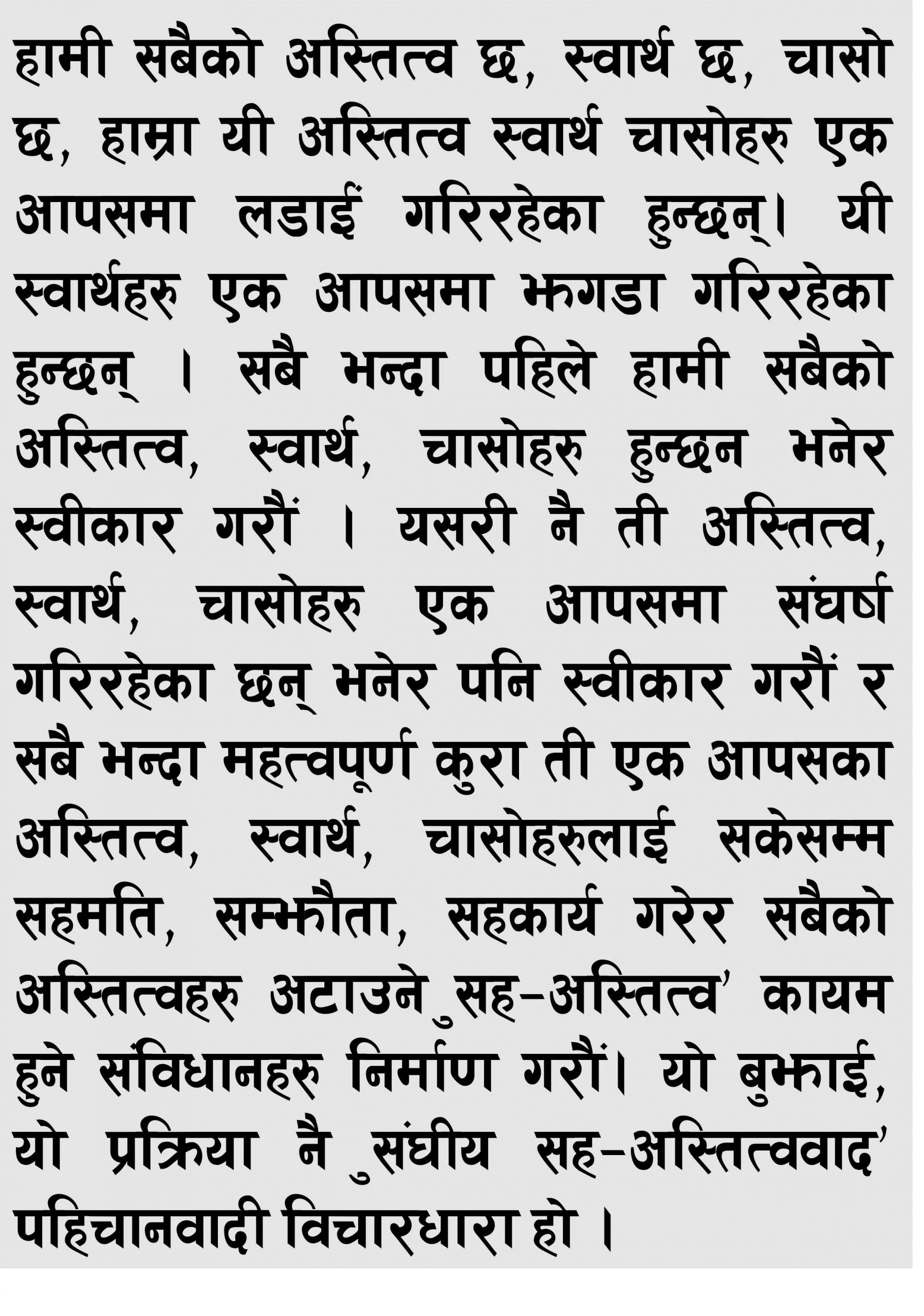 सबै भन्दा पहिले संसारका जति पनि हामी मान्छेहरु छौं हामी सबैमा आ–आफ्नो अस्तित्व छ। आ–आफ्नो स्वार्थ छ, आ–आफ्नो interest (चासो) छ भनेर सहर्ष स्वीकार गरौं । म त सबै त्यागेको माक्र्सवादी पो त, म त सबै त्यागेको धार्मिक पो त, म त सबैको नेता पो त मेरो केही स्वार्थ छैन भनेर ढोंगी नहोउ, ढोंगी नबनौं। हामी सबैको अस्तित्व छ, स्वार्थ छ, चासो छ, हाम्रा यी अस्तित्व स्वार्थ चासोहरु एक आपसमा लडाईं गरिरहेका हुन्छन्। यी स्वार्थहरु एक आपसमा झगडा गरिरहेका हुन्छन् । सबै भन्दा पहिले हामी सबैको अस्तित्व, स्वार्थ, चासोहरु हुन्छन भनेर स्वीकार गरौं । यसरी नै ती अस्तित्व, स्वार्थ, चासोहरु एक आपसमा संघर्ष गरिरहेका छन् भनेर पनि स्वीकार गरौं र सबै भन्दा महत्वपूर्ण कुरा ती एक आपसका अस्तित्व, स्वार्थ, चासोहरुलाई सकेसम्म सहमति, सम्झौता, सहकार्य गरेर सबैको अस्तित्वहरु अटाउने ‘सह–अस्तित्व’ कायम हुने संविधानहरु निर्माण गरौं। यो बुझाई, यो प्रक्रिया नै ‘संघीय सह–अस्तित्ववाद’ पहिचानवादी विचारधारा हो ।