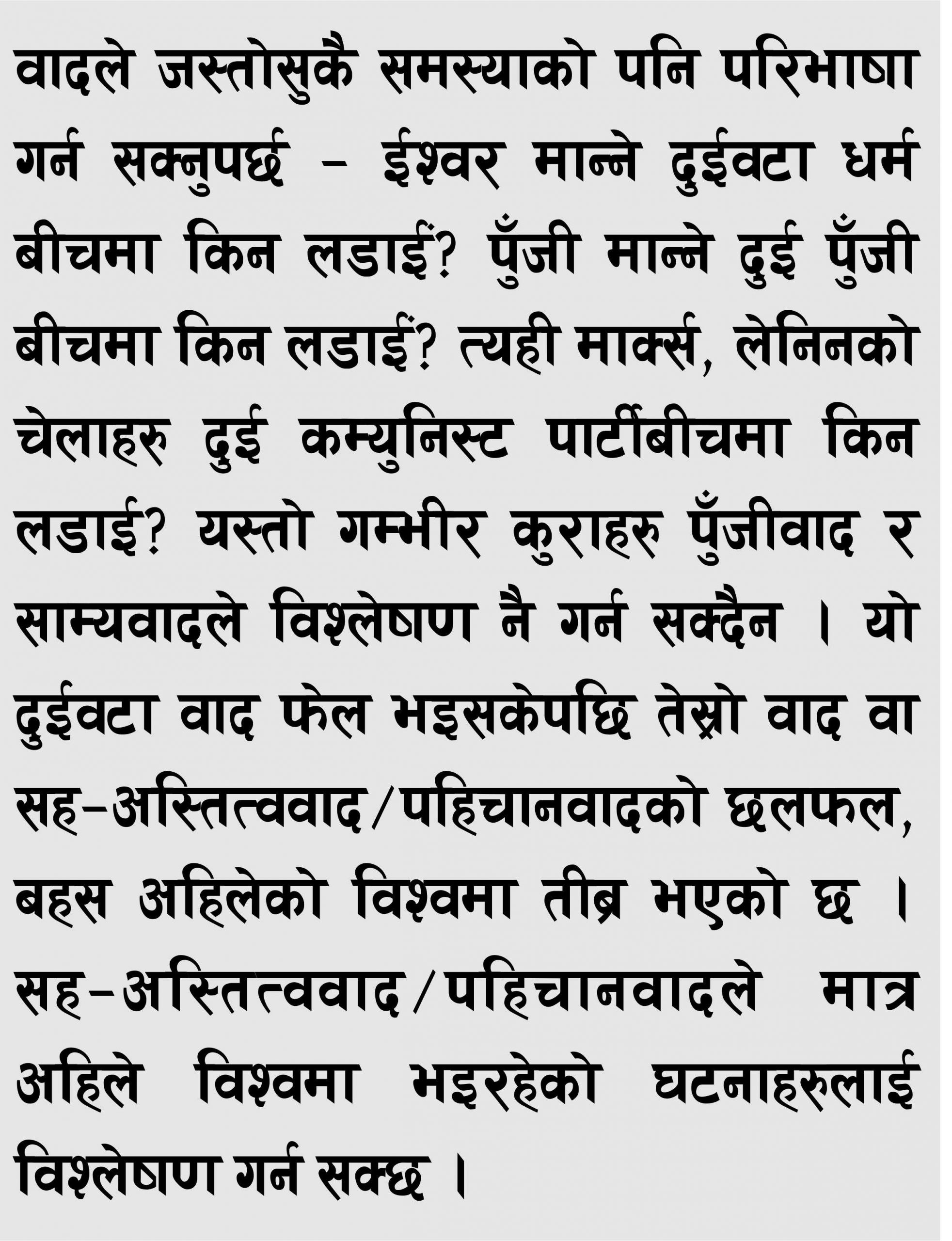 भन्नेहरुले भन्छन् – विश्वमा पुँजीवाद र साम्यवाद दुईवटामात्र वाद छ रे । तर सह–अस्तित्वावाद वा पहिचानवादको आँखाले हेर्दा यी दुईवटै वादहरुले विश्वमा काम गरिरहेको देखिंदैन ।