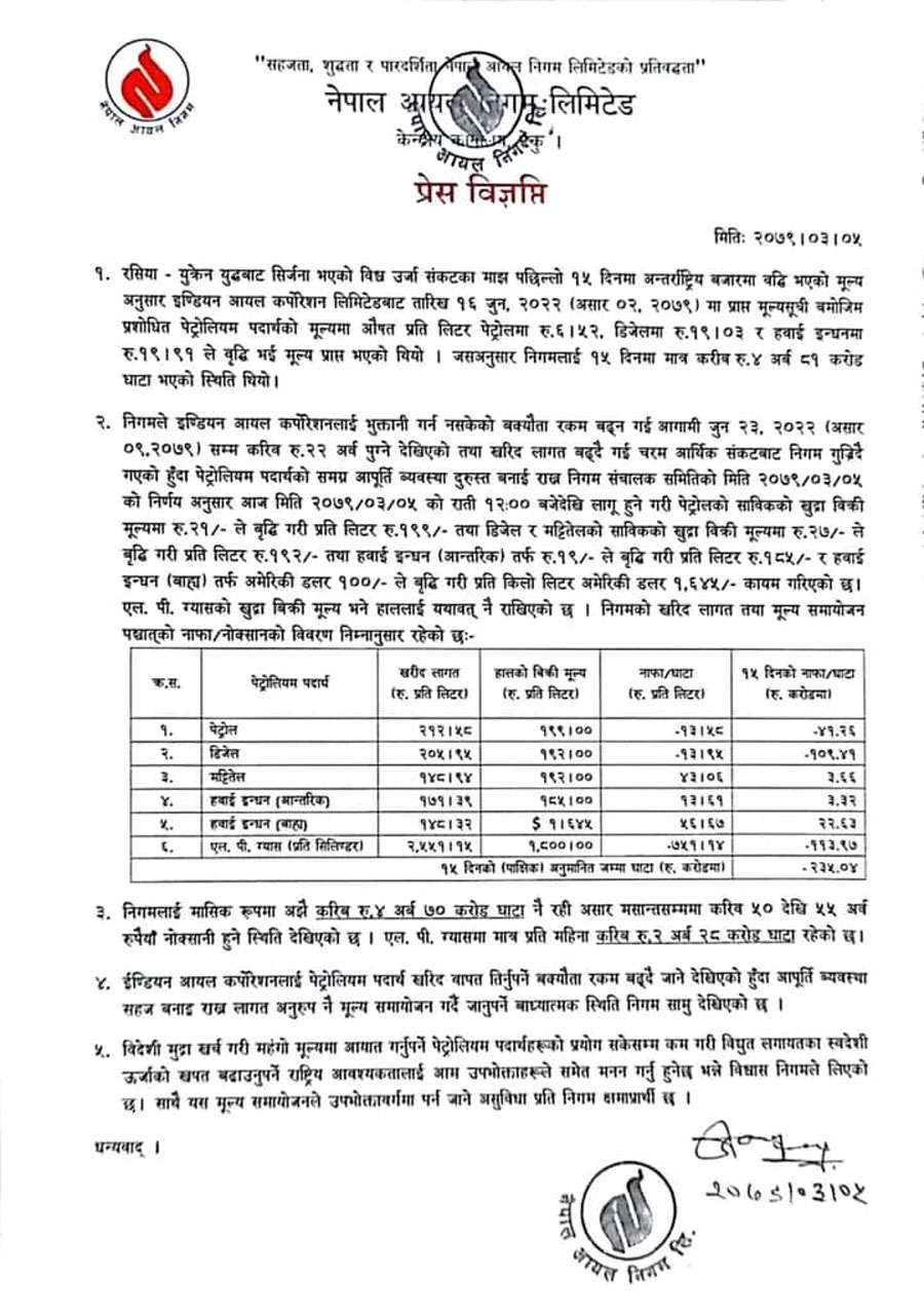 निगम सञ्चालक समितिको आकस्मिक बैठक बसी पेट्रोलमा प्रति लिटर २१ रुपैयाँ र डिजेल तथा मट्टीतेलमा प्रतिलिटर २७ रुपैयाँले मुल्य बृद्धि गरेको हो । नयाँ मूल्य आइतबार राति १२ बजेदेखि लागु हुने निगमले विज्ञप्तिमा जनाएको छ ।