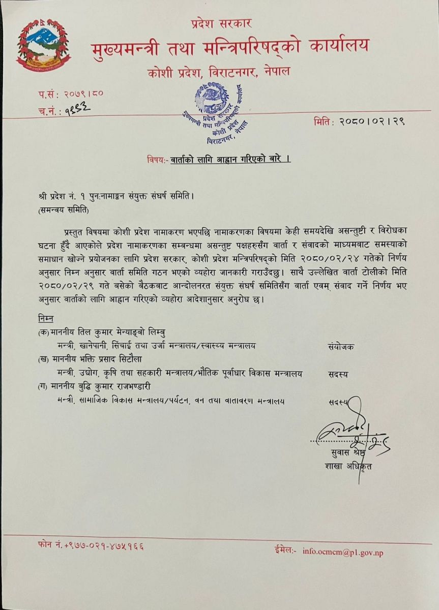 प्रदेश नं. १ पुनः नामाङकन संयुक्त संघर्ष समितिको नाममा पत्र पठाए वार्तामा बस्ने समितिले बताएको थिए । त्यसपछि सोमबार प्रदेश सरकारले समितिलाई वार्तामा बोलाएको हो ।