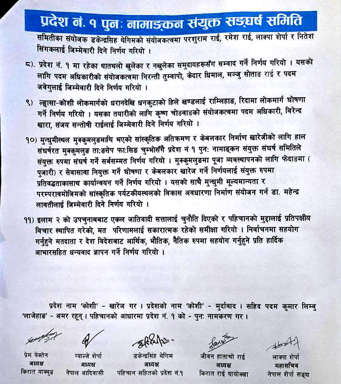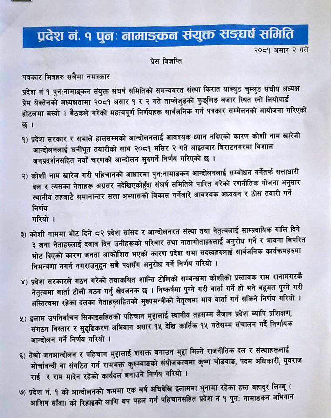 कियाचु अध्यक्ष येक्तेन, नेपाल आदिवासी अध्यक्ष ग्याल्जे शेर्पा, पहिचान सहितको प्रदेश नं. १ अध्यक्ष डकेन्द्रसिंह थेगिम, किरात राई यायोक्खा अध्यक्ष जीवन हाताचो राई र नेपाल शेर्पा संघ महासचिव लाक्पा शेर्पाद्वारा हस्ताक्षरित विज्ञप्ति जारी गर्दै कोशी नाम खारेजी आन्दोलनलाई नयाँ चरणमा सुरु भएको संयुक्त संघर्ष समितिले घोषणा गरेको छ ।