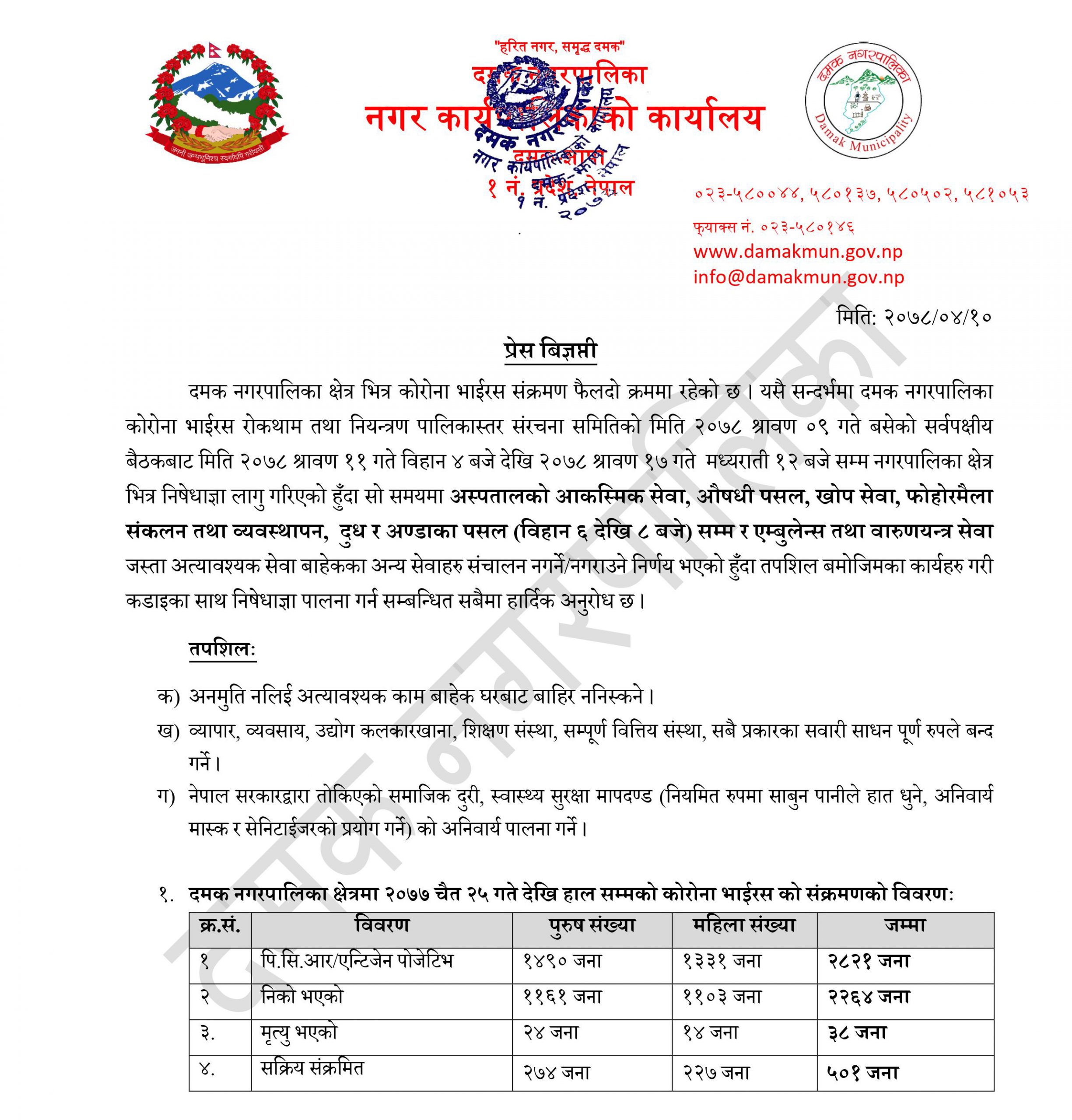 दमक, ११ साउन । दमकमा कोरोना संक्रमण फैलदो क्रममा रहेको भन्दै रोकथाम तथा नियन्त्रणको लागि कडा निषेधाज्ञा लागू गरेको छ । शुक्रबार दमक नगरपालिकामा बसेको सर्वपक्षीय भेलाले गरेको निर्णय अनुसार सोमबार विहान ४ बजेदेखि एक हप्तासम्म निषेधाज्ञा गरेको हो ।