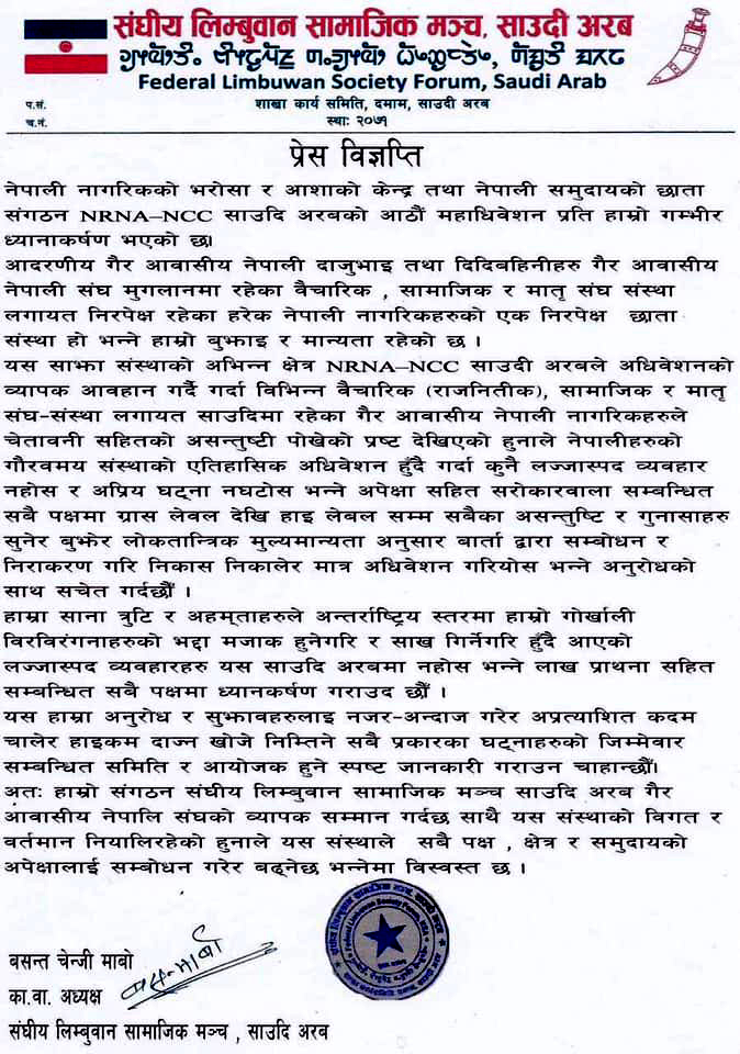 एनआरएनए साउदीको आठौं महाधिवेशन प्रति हाम्रो गम्भीर ध्यानाकर्षण गर्दै लिम्बुवान सामाजिक मञ्च साउदीले विज्ञप्ति जारी गरेको हो । सामाजिक मञ्च संघीय लोकतान्त्रिक राष्ट्रिय मञ्चको प्रवास समिति हो ।