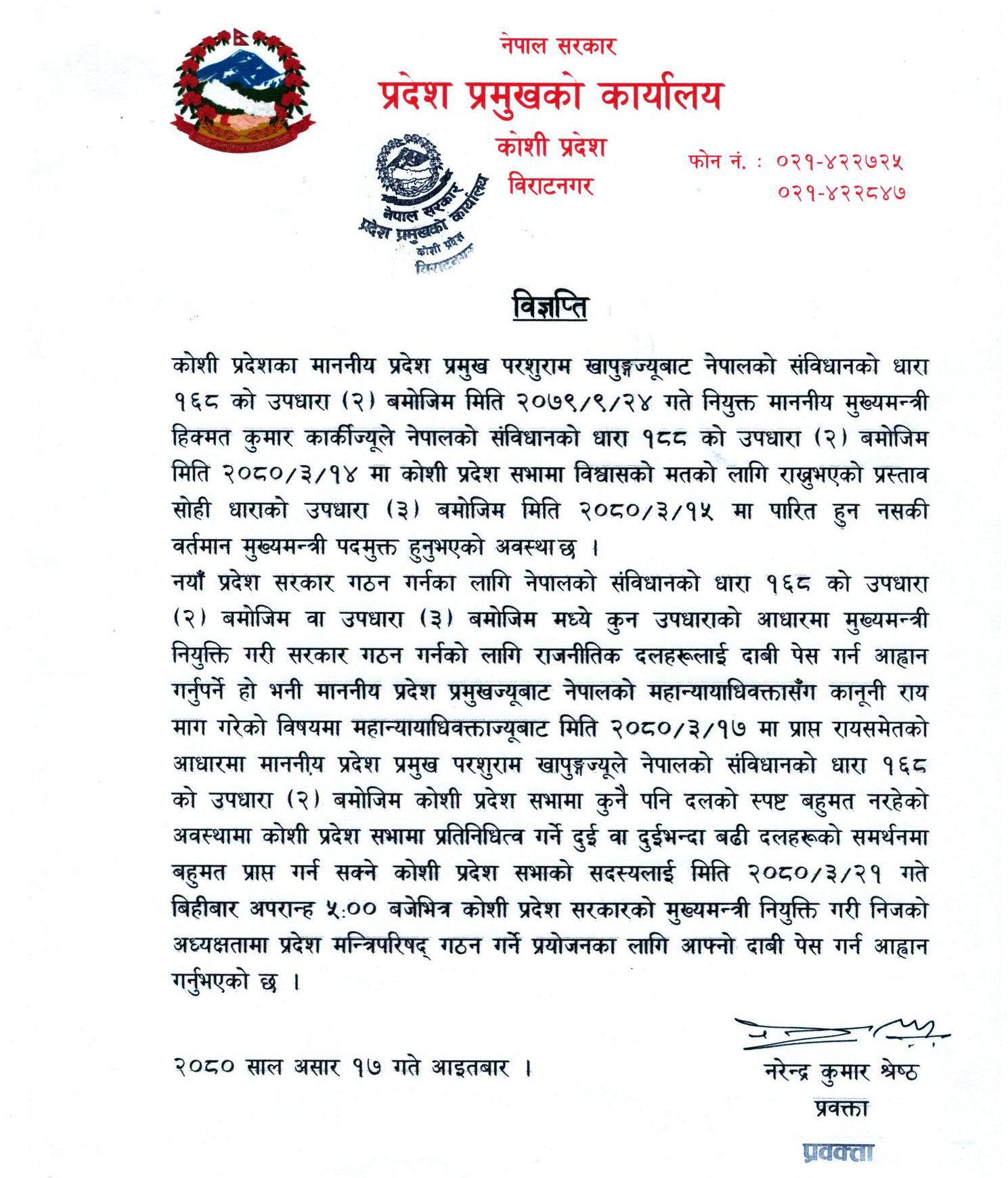हिक्मतकुमार कार्की नेतृत्वको प्रदेश १ सरकार गत शुक्रबार ढलेको थियो । त्यसपछि कानूनी परामर्शमा रहेका प्रदेश प्रमुख खापुङले सरकार गठनको आव्हान गरेका हुन् ।