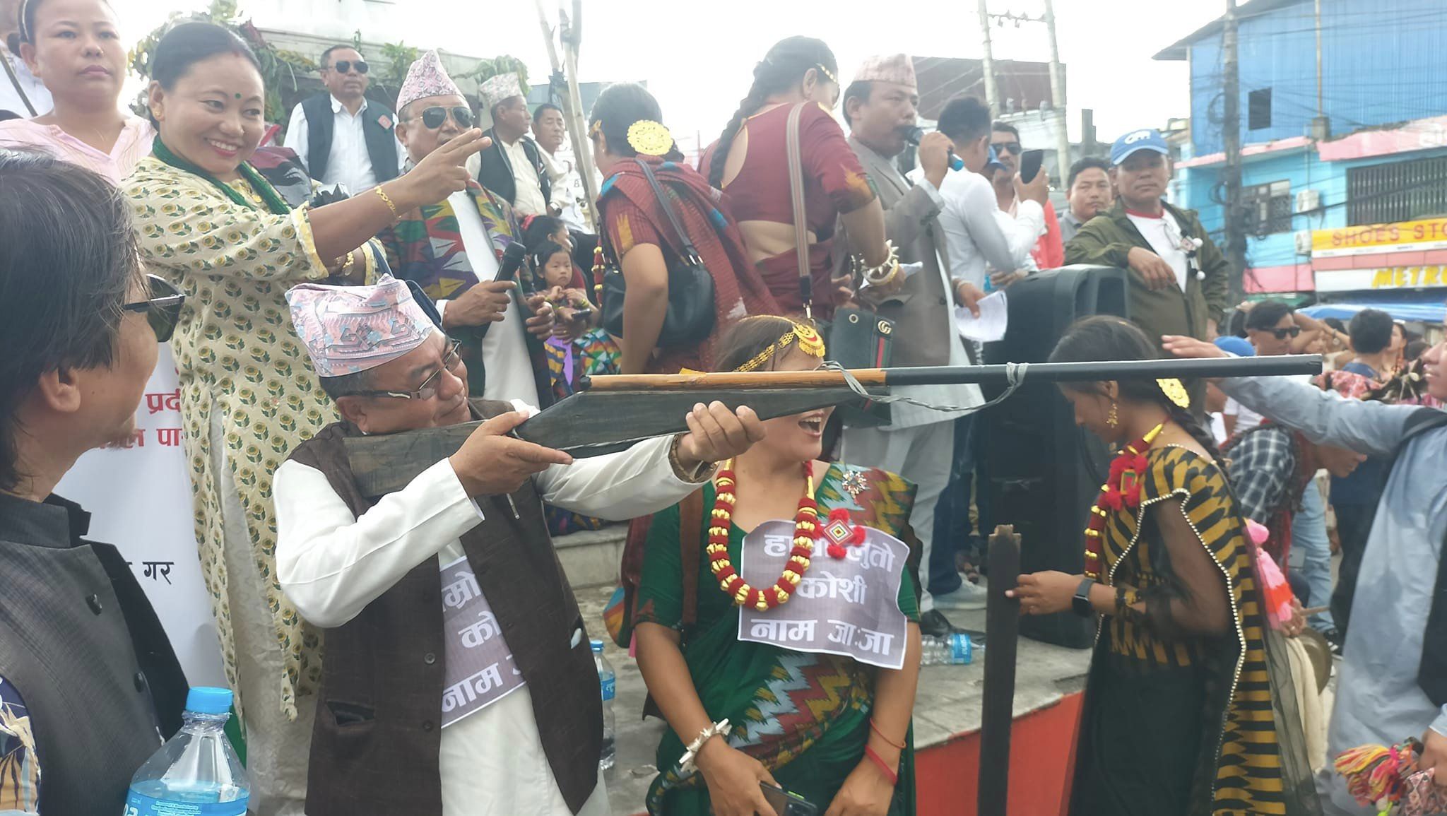 प्रदेशको नाम कोशी खारेज गर, प्रदेशको नाम कोशी मान्दैनौं, पहिचान विरोधी होसियार, सहिद लाजेहाङ् अमर रहुन् भन्ने नाराका साथ चौक परिक्रमा गरी कोण सभामा परिणत भएको र्यालीमा आ–आफ्नो भेषभूषामा सजिएका सांस्कृतिप्रेमीहरु हजारौंको उपस्थिति रहेको थियो ।