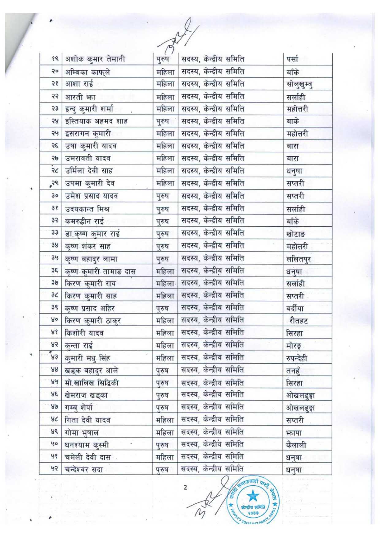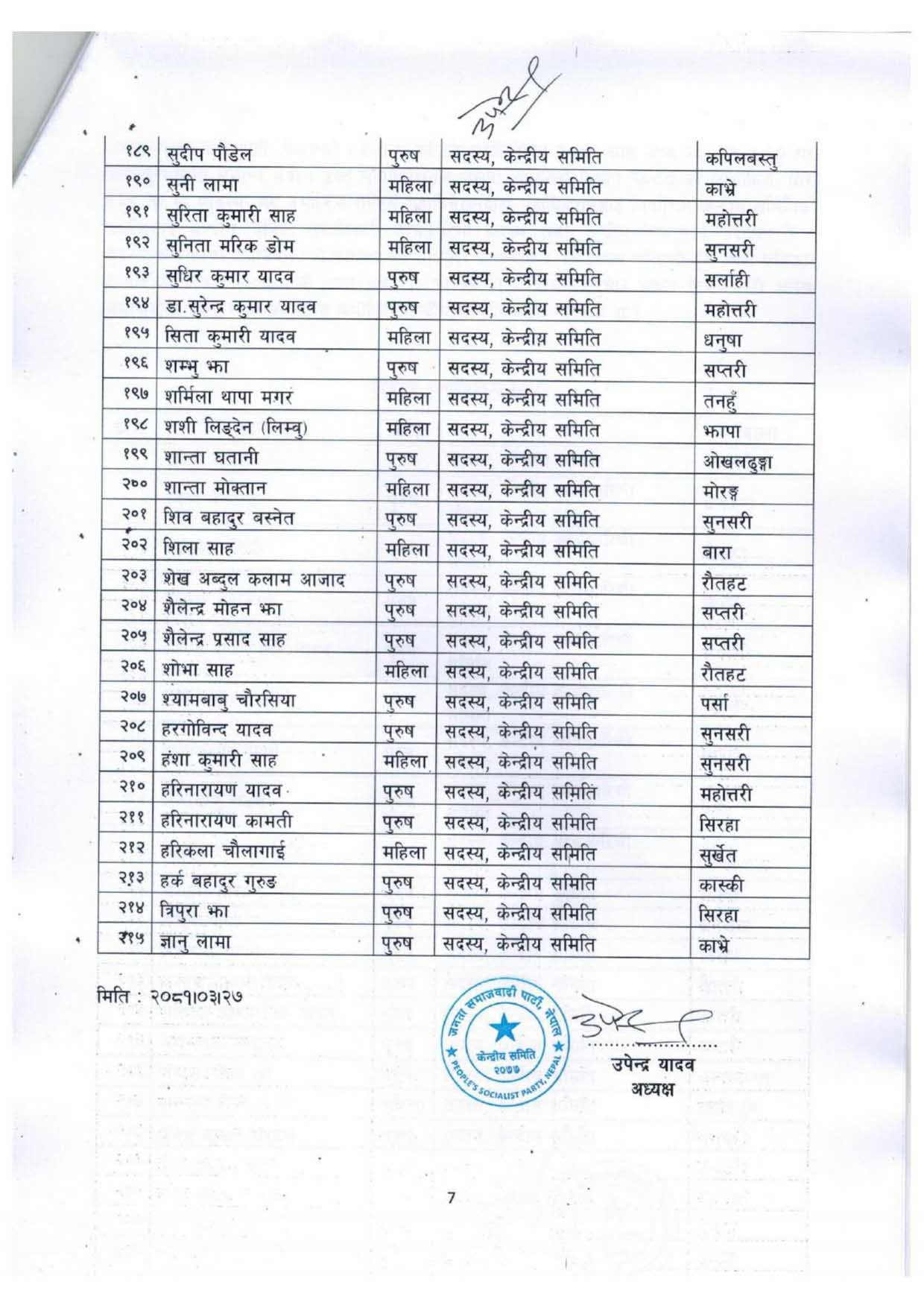 दमक, २६ असार । जनता समाजवादी पार्टी, नेपालका अध्यक्ष उपेन्द्र यादवले ८ जना केन्द्रीय कार्यकारिणी सदस्य (९ पदाधिकारी) र २०६ जना केन्द्रीय सदस्य सहित २१५ जनाकाे समिति घाेषणा गरेका छन् ।
