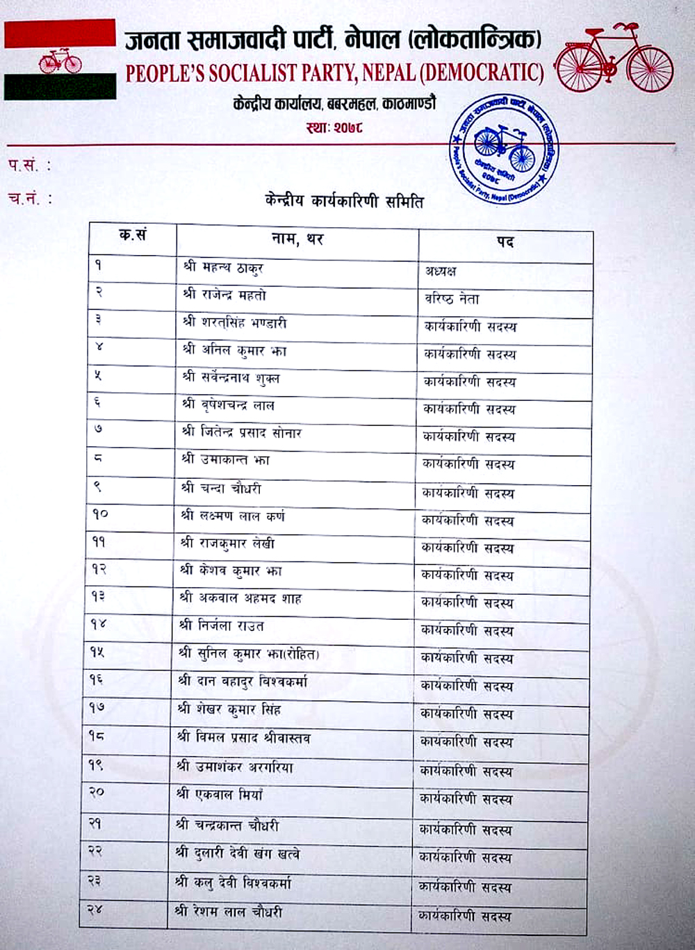 हेर्नुहोस् २४ सदस्यीय कार्यकारिणी समितिको नामावलीः