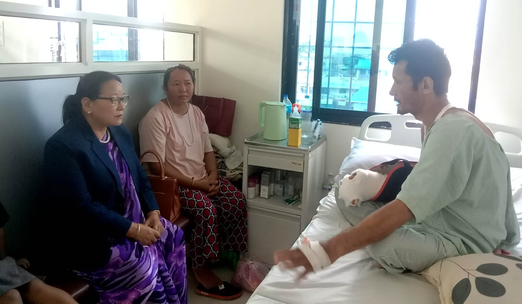 घरमा घाँस काट्ने मेसिनले घाँस काट्ने क्रममा हातका औलाहरु काटिएपछि हाल न्यूरो अस्पताल विराटनगरमा उपचार गराईरहेका योङ्हाङकाे स्वास्थ्य अवस्था बुझ्न आइतबार मन्त्री तुम्बाहाम्फे अस्पताल पुगेकि हुन् ।