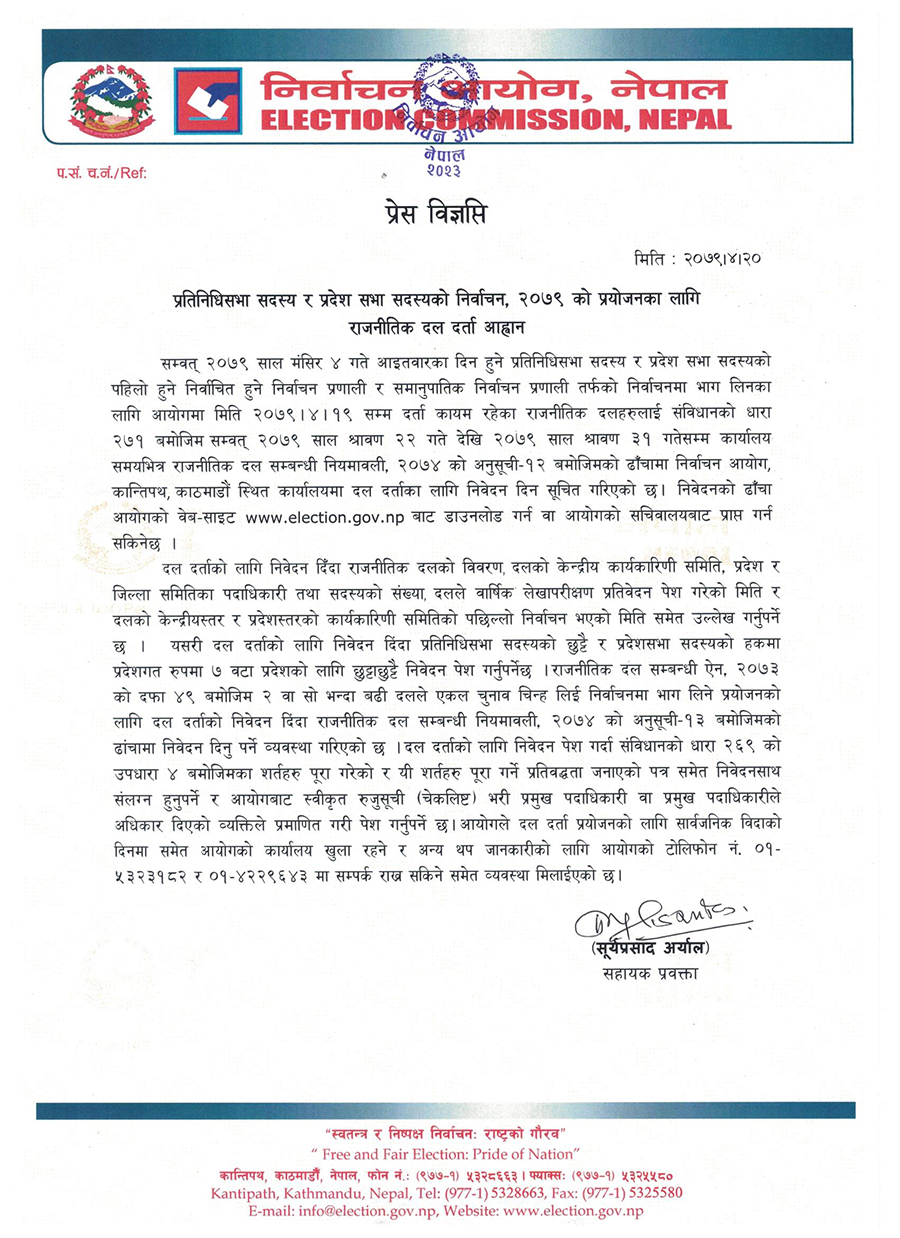 आयोगले दल दर्ताको निवेदनका लागि दलको विवरण, दलको केन्द्रीय, प्रदेश र जिल्ला समितीका पदाधिकारीको विवरण र संख्या अनि वार्षिक लेखापरीक्षण प्रतिवेदन समेत माग गरेको छ ।