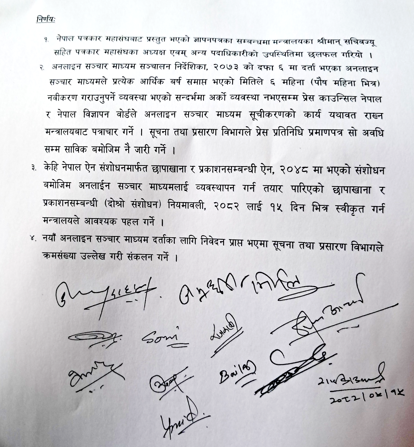 यो व्यवस्थाका सन्दर्भमा अर्को व्यवस्था नभएसम्म प्रेस काउन्सिल नेपाल र नेपाल विज्ञापन बोर्डले अनलाइन सञ्चार माध्यम सूचीकरणको कार्य यथावत राख्न मन्त्रालयबाट पत्राचार गर्ने सहमति छ । सूचना तथा प्रसारण विभागले प्रेस प्रतिनिधि प्रमाणपत्र सो अवधिसम्म साविक बमोजिम नै जारी गर्ने सहमति पनि भएको छ ।