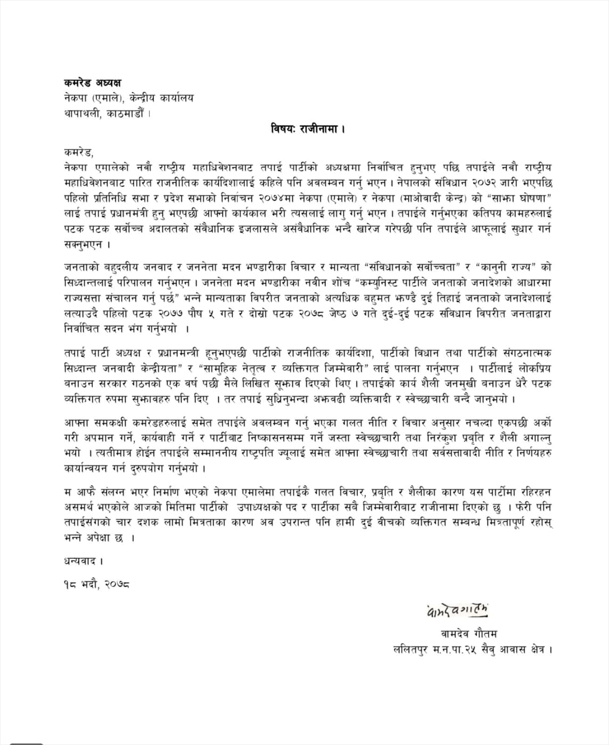 पार्टी अध्यक्ष केपी ओलीलाई सम्बोधन गरेको पत्र पार्टी मुख्यालय थापाथलीमा गएर बुझाउँदै आफूले पार्टी छाडेको जानकारी गराएका हुन् ।