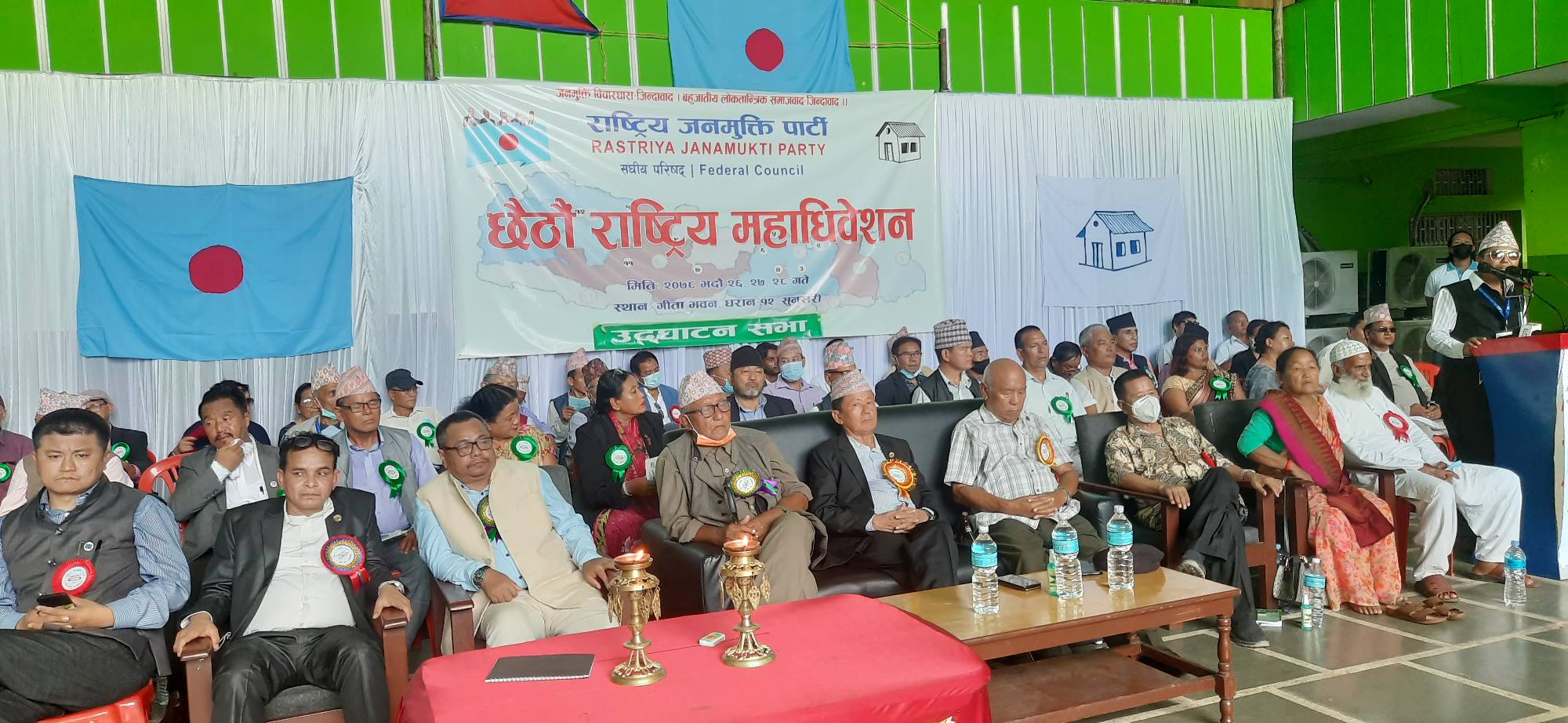 राष्ट्रिय जनमुक्ति पार्टीका संघीय अध्यक्ष केपी पालुङ्गवाको अध्यक्षतमा सम्पन्न छैटौं राष्ट्रिय महाधिवेशन उद्धघाटन सत्र सम्पन्न भएको छ । उद्घाटन सत्रमामा पार्टीका उपाध्यक्ष कमला थापा, रविन्द्र उच्च नेपाली, केन्द्रिय सचिव मनीराम चौलागाँई, सामाजिक लोकतान्त्रक पार्टी परित्याग गरी राष्ट्रिय जनमुक्ति पार्टीमा प्रवेश गर्नु भएका नेता मान वहादुर राई, माओवादीबाट प्रवेश गर्नु भएका मजित अलि, संघीय लिम्वुवान मञ्चका केन्द्रिय सचिव हालै पार्टी प्रवेश गर्नु भएका गजेन्द्र आङ्गवो, हङ्गकङ्ग जनमुक्ति मञ्चका प्रतिनिधि आईन्बा राई, अमेरिकाका प्रतिनिधि विनोद पोमु, कत्तार प्रतिनिधि मन थापा, जनवर्गिय संगठनहरुको तर्फबाट राष्ट्रिय भुतपुर्व सैनिक संगठनका अध्यक्ष भिम राना, एकल जातिय संगसंगठनहरुको तर्फबाट नेपाल तामाङ घेदुङका संघिय अध्यक्ष मोहन गोले तामाङ लगायतले उद्धघाटन सत्रलाई सम्वोधन गरेका थिए ।