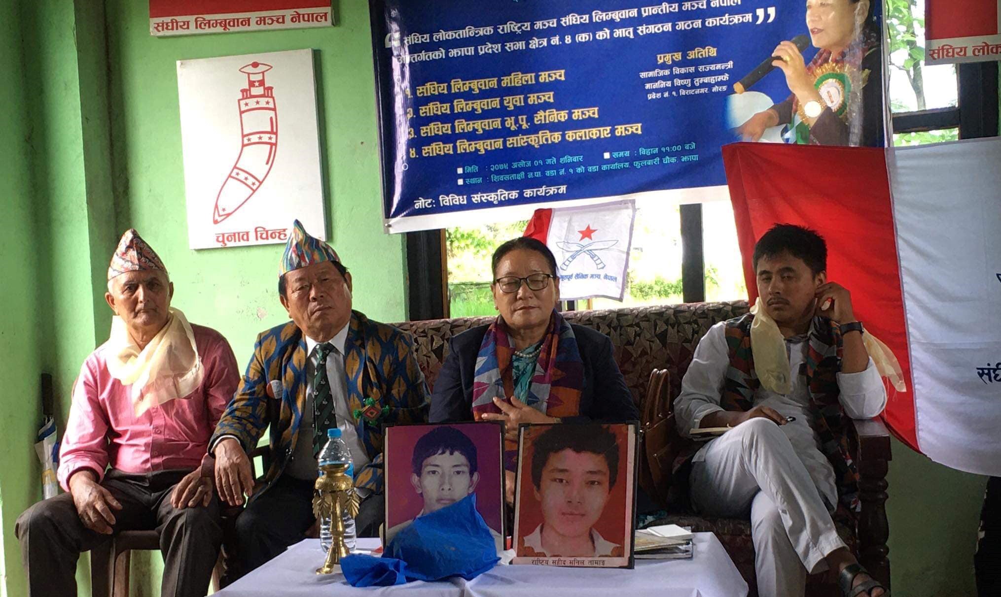 शिबसताक्षी १ असोज / संघीय लोकतान्त्रिक राष्ट्रिय मञ्च नेपाल, संघीय लिम्बूवान प्रान्तिय मञ्च झापा क्षेत्र नम्बर ४ (१) अन्तर्गत चारवटा भातृसंगठनहरु पुनःगठन गरिएको छ । शिबसताक्षी नगरपालिकाको वडा नम्बर १ धरमपुरस्थित फूलबारी चौकमा सम्पन्न समारोहमा संघीय लिम्बूवान प्रान्तीय मञ्चको भातृसंगठन संघीय लिम्बूवान महिला मञ्च, लिम्बूवान युवा मञ्च, लिम्बूवान भूपु सैनीक मञ्च र साँस्कृतिक कलाकार मञ्च गठन गरिएको हो ।