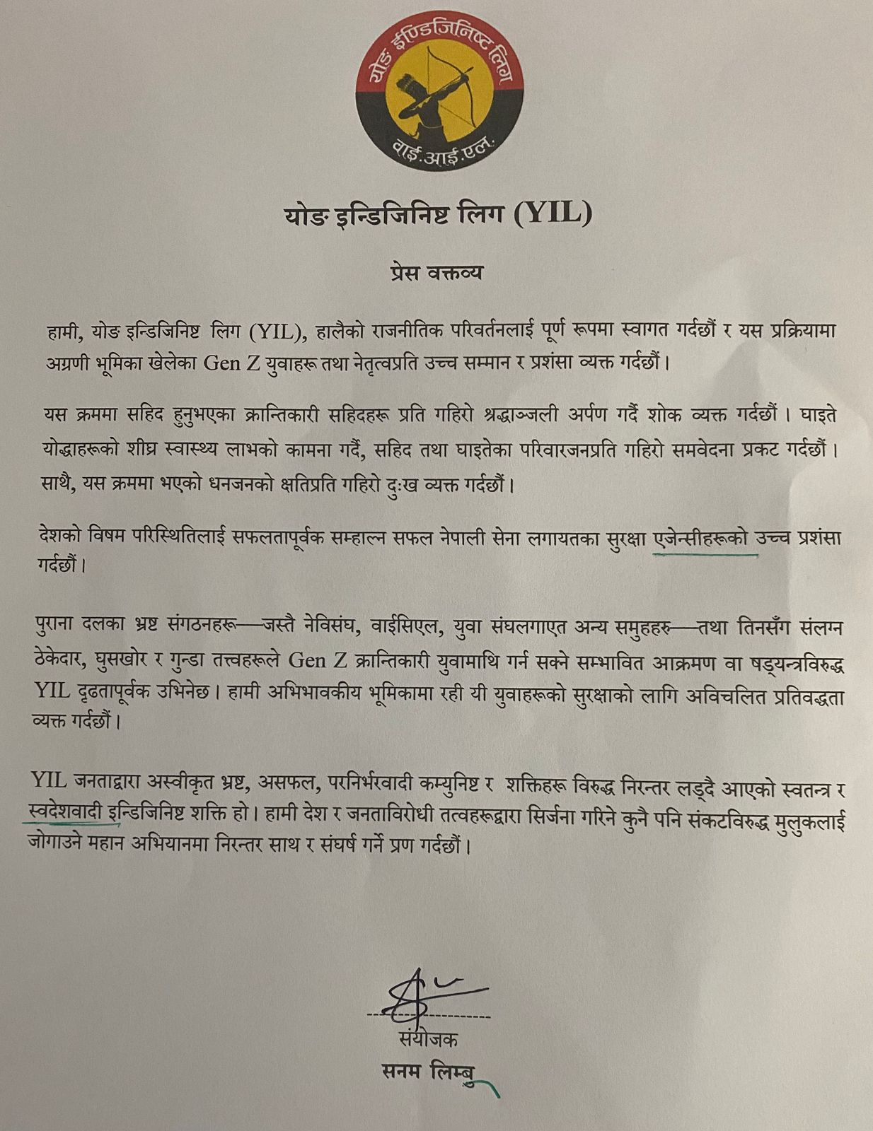 वाईआईएलका संयोजक सनम लिम्बूले जारी गरेको वक्तव्यमा हालै भएको जनआन्दोलनका क्रममा सहिद भएका क्रान्तिकारी सहिदहरूलाई श्रद्धाञ्जली अर्पण गर्दै सहिद परिवारप्रति गहिरो संवेदना व्यक्त गरिएको छ। साथै सहिदहरूको बलिदानलाई व्यर्थ हुन नदिई सफलतापूर्वक सम्पन्न नेपाली सेनालगायतका सुरक्षाकर्मीहरूको योगदानलाई उच्च प्रशंसा गरिएको छ।