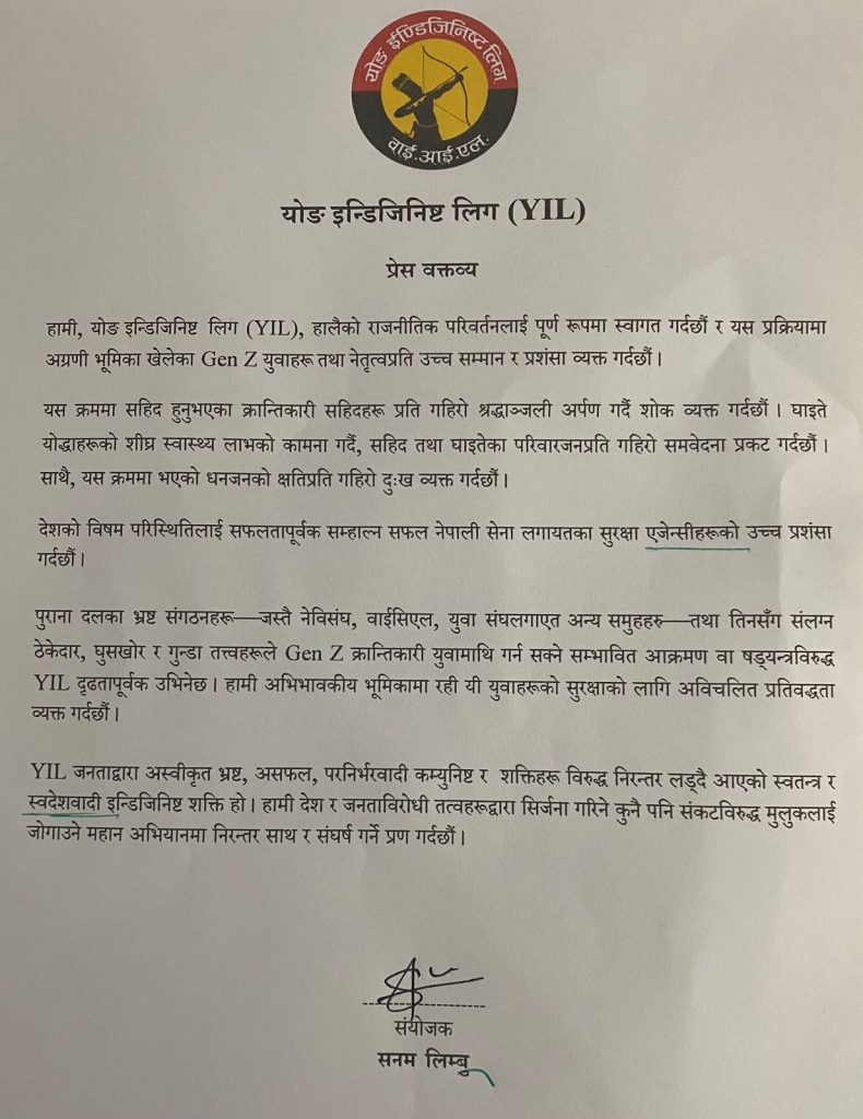 ललितपुर,२९ भदाैं । युथ इन्डिजिनिष्ट लिग (वाईआईएल)ले देशमा हालै भएको राजनीतिक परिवर्तनलाई पूर्ण रूपमा स्वागत गर्ने घोषणा गरेको छ। संगठनले यो प्रक्रियामा अग्रणी भूमिका खेलेका जेनजीहरूको नेतृत्व तथा योगदानप्रति उच्च सम्मान र प्रशंसा व्यक्त गरेको छ।