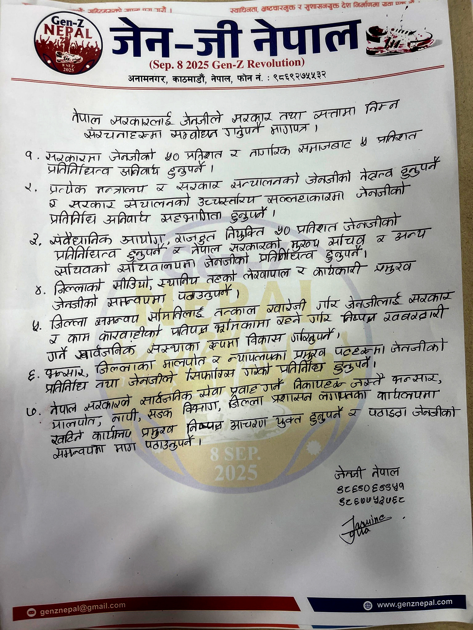 २. प्रत्येक मन्त्रालय र सरकार सञ्चालनकाे जेनजीकाे नेतृत्व हुनुपर्ने र सरकार संचालनकाे उच्चस्तरिय सल्लाहकारमा जेनजीकाे प्रतिनिधि अनिवार्य सहभागिता हुनुपर्ने ।