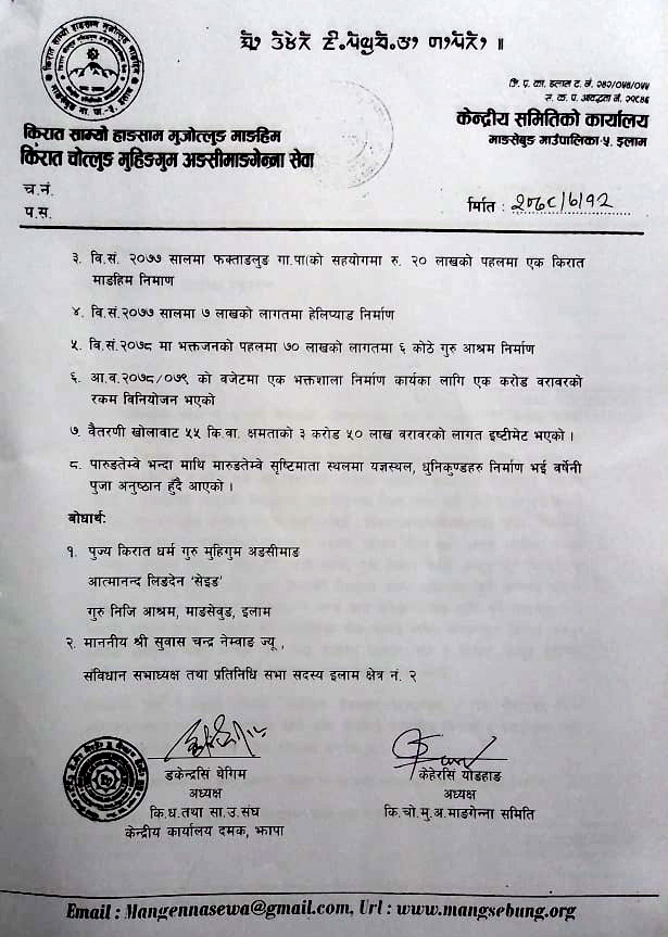 किरात धार्मिक संस्थाका प्रतिनिधि टोलीले संस्कृति पर्यटन तथा नागरिक उड्डयन मन्त्री प्रेम आले मगरको कार्यकक्षमा शुक्रबार सो ध्यानाकर्षण पत्र बुझाएका हुन् ।