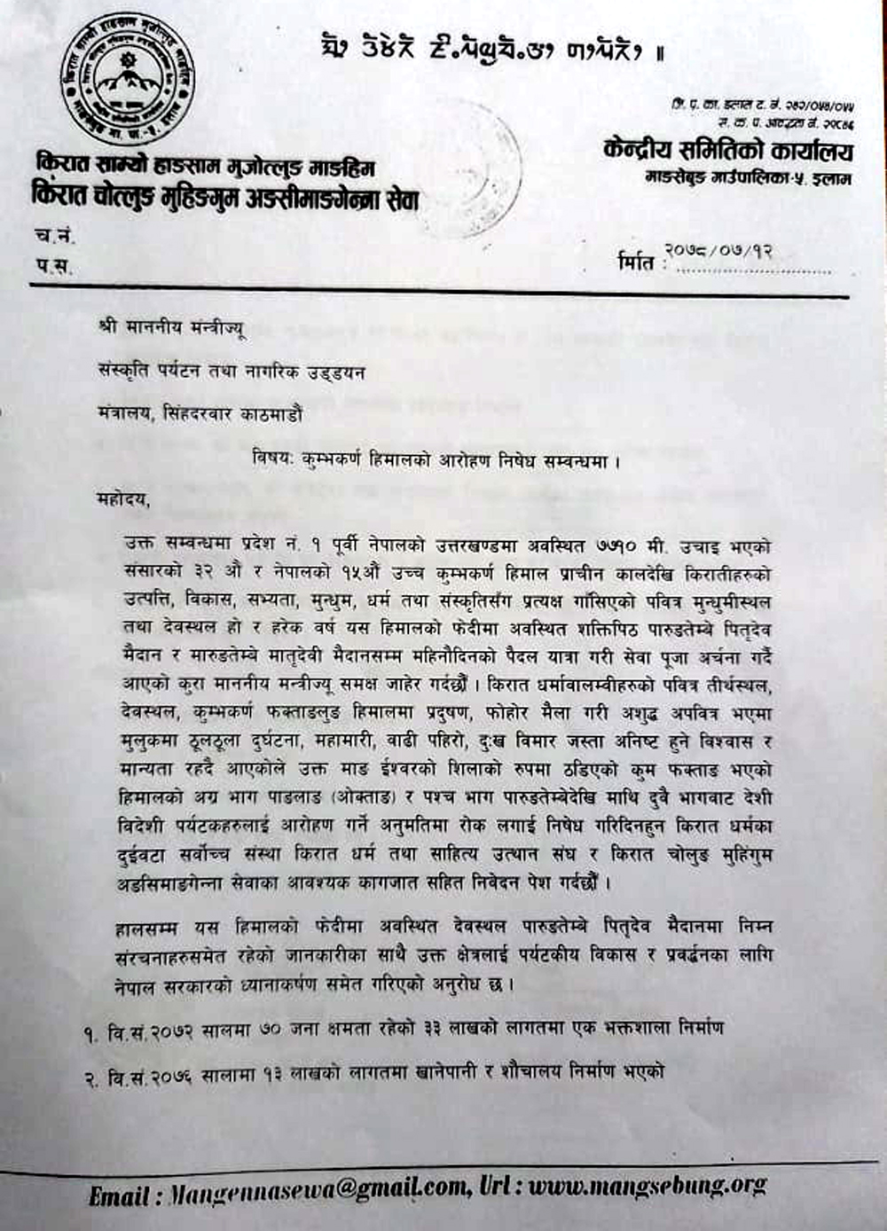 पवित्र महातिर्थस्थल फक्ताङलुङ (कुम्भकर्ण) हिमालको अग्र भाग पाङलाङ र पश्च भाग पारुङतेम्बेदेखि माथि दुवै भागबाट वाह्रय तथा आन्तरिक पर्यटकहरुको आरोहणमा रोक लगाउन संस्कृति पर्यटन तथा नागरिक उड्ड्डयन मन्त्रालयलाई ध्यानाकर्षण पत्र बुझाएका हुन् ।
