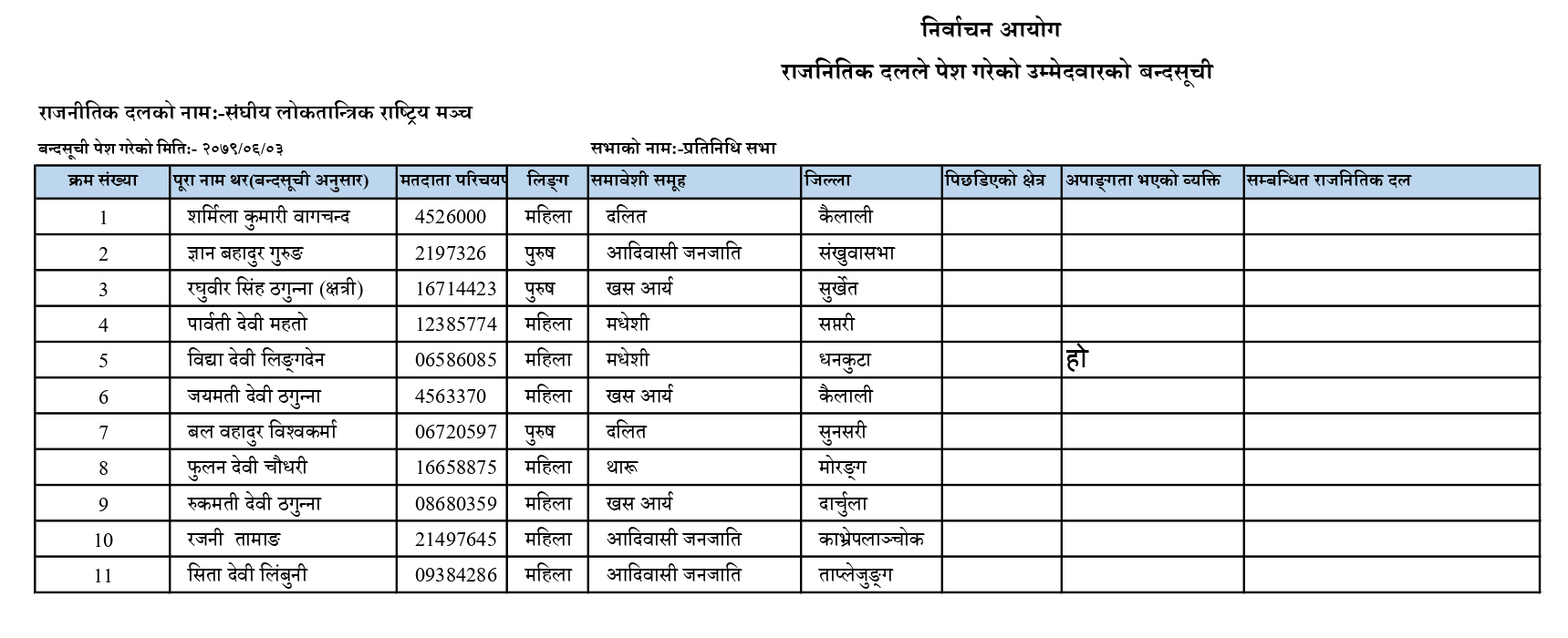 यसैगरी संघीय लोकतान्त्रिक राष्ट्रिय मञ्चले न्यूनतम १० प्रतिशत पु¥याएर निर्वाचन आयोगको प्रतिनिधिसभाको समानुपातिक बन्दसूचीमा नाम पेश गरेको छ ।