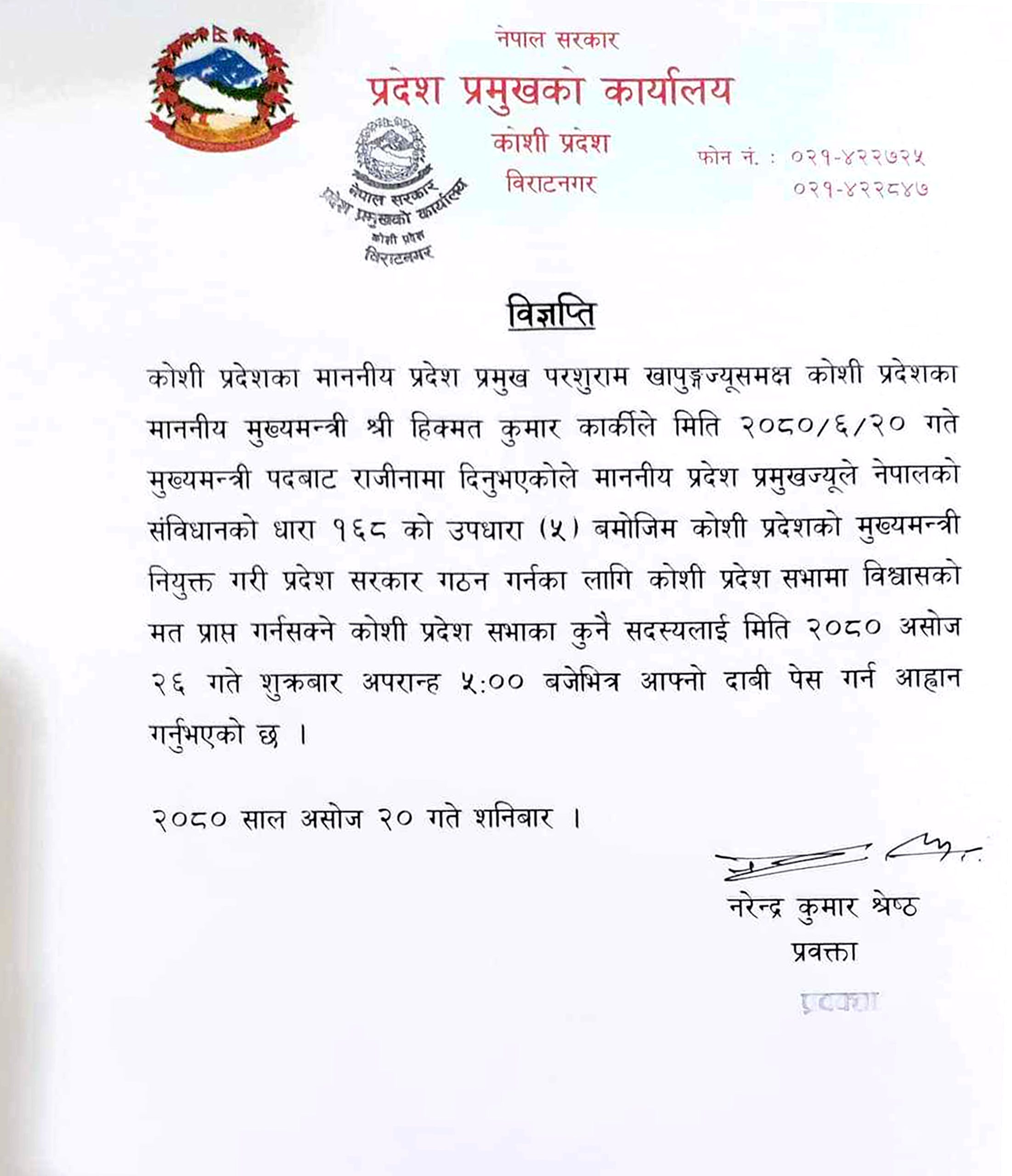 प्रदेश प्रमुख पर्शुराम खापुङले संविधानको धारा १६८ को उपधारा ५ अनुसार नयाँ सरकार गठनको लागि आह्वान गरेका छन् ।