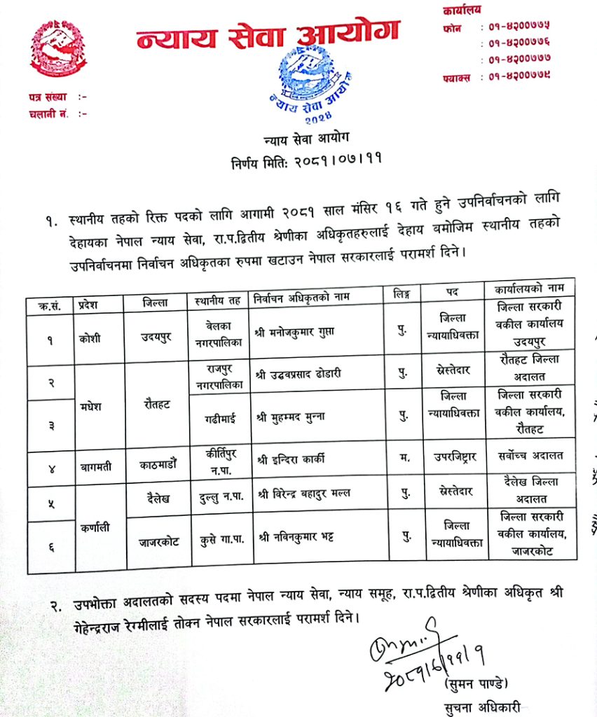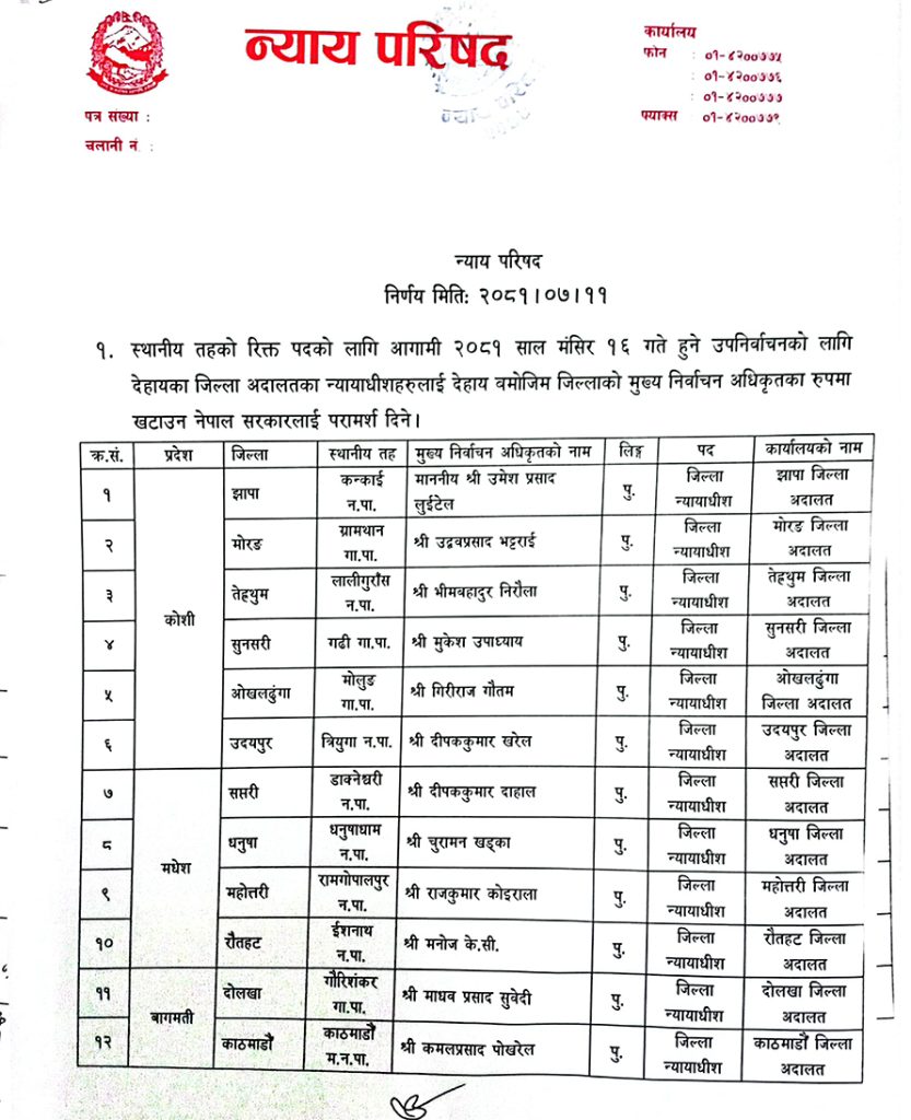 आगामी मंसिर १६ गते हुने उपनिर्वाचनका लागि न्याय परिषदले ३१ जिल्लामा मुख्य निर्वाचन अधिकृत तोक्न निर्वाचन आयोगमा नाम सिफारिस गरेको हो । जिल्ला अदालतका न्यायाधीशहरु मुख्य निर्वाचन अधिकृत तोकिएका हुन् ।