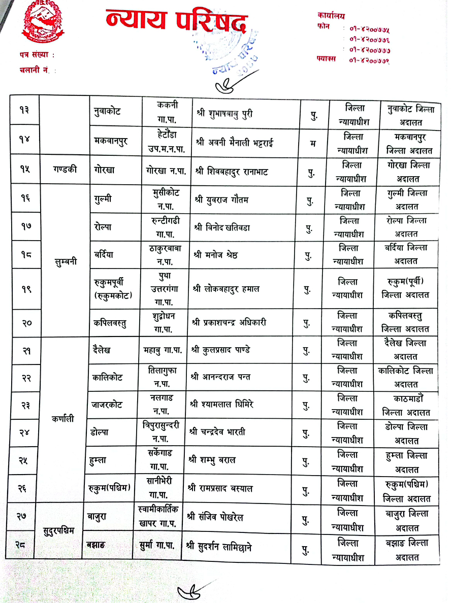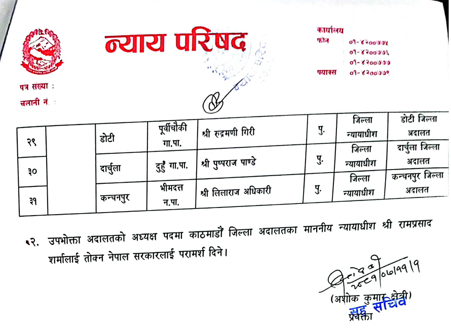 न्याय परिषदले नयाँ गठन भएको उपभोक्ता अदालतको न्यायाधीशमा जिल्ला अदालत काठमाडौंको न्यायाधीश रामप्रसाद शर्मा र सदस्यमा गेहेन्द्रराज रेग्मीलाई तोक्न पनि सिफारिस गरेको छ ।