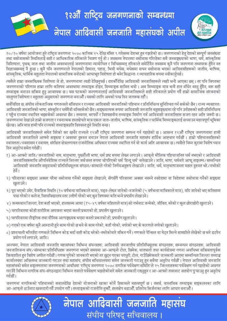 जारी अपीलमा भनिएको छ –‘त्यसैले हाम्रा जनसांख्यिक विशेषता जे हो, जनगणनामा त्यही देखिनुपर्छ । दशकौँदेखि आदिवासी जनजातिहरूले त्यही भन्दै आएका छन् । तर पनि विगतका जनगणनाको परिणाम हाम्रा लागि कतिपय अवस्थामा तथ्यांक होइन, मिथ्यांक साबित भयो । अब मिथ्यांक मात्र भन्दै हात बाँधेर बस्नु हुँदैन, बरू सही तथ्यांक बनाउन सक्रिय हुनु आवश्यक छ । यस पटकको जनगणनालाई आदिवासी जनजातिहरूले सही तरिकारले प्रयोग गर्दै हाम्रो सामाजिक संरचनाको वस्तुगत विशेषता र बहुलता अनुसारको जनगणना बनाऔँ । यसको लागि अबको पन्ध्र दिन जागरूक रहौँ ।