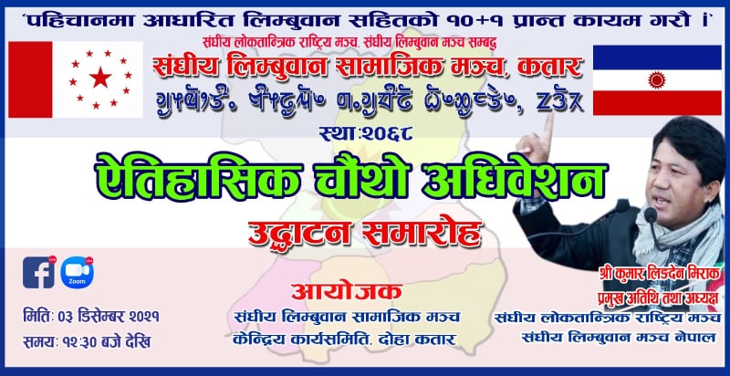 कतार, ८ मंसिर । संघीय लोकतान्त्रिक राष्ट्रिय मञ्च तथा संघीय लिम्बुवान मञ्च, नेपालको प्रवास समिति संघीय लिम्बुवान सामाजिक मञ्च कतारको चौंथो अधिवेशन हुने भएको छ ।