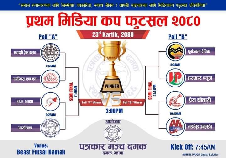 दमक, २२ कार्तिक । पत्रकार मञ्च दमक, झापाले दसैं, तिहार, छट पर्वको अवसर पारेर मिडियाकप फुटसल प्रतियोगिता आयोजना गर्ने भएको छ ।