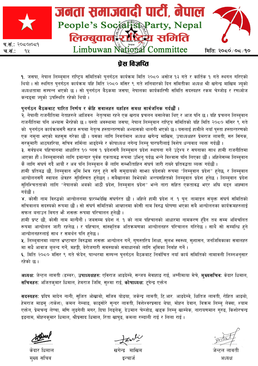 १. जसपा, नेपाल लिम्बुवान राष्ट्रिय समितिको पुनर्गठन कार्यक्रम मिति २०८० असोज १३ गते र कार्तिक १ गते स्थगन गरिएको थियो । सो स्थगित पुनर्गठन कार्यक्रम यहि मिति २०८० मंसिर ९ गते शनिबारको दिन समितीका अध्यक्ष श्री खगेन्द्र माखिम ज्यूको अध्यक्षतामा सम्पन्न भएको छ । सो पुनर्गठन बैठकमा जसपा, नेपालका कार्यकारिणी समिति सदस्यहरु रकम चेम्जोङ र रणध्वोज कन्दङ्वा ज्युको उपस्थिति रहेकोे थियो ।